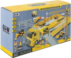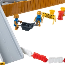 - Indhold i sættet: TIR med udfoldelig platform, tårnkran, betonblander, vejrulle, gaffeltruck, bæltegraver, læsser, tipvogn, 2 figurer, kegler, barrierer, skilte, tønder, bånd, trillebør og skovl.