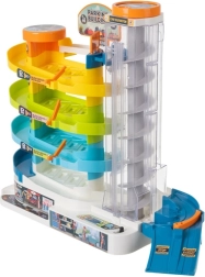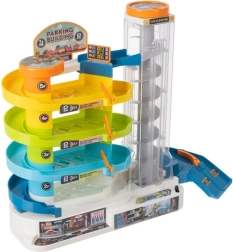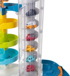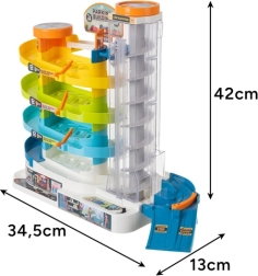 Dette farverige parkeringshus giver børn dynamisk leg med biler – løft dem med den manuelle eller elektriske elevator til de øverste etager, og se dem suse ned igen på de spiralformede baner. Med fem niveauer er der masser af plads til kørsel, parkering og skabelse af egne trafiksituationer.
