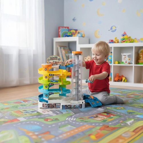 Et omfattende multietagers legeområde med jævne nedkørsler og parkeringspladser, der stimulerer fantasi, finmotorik og leg for flere børn på én gang.