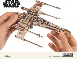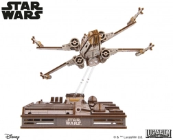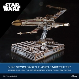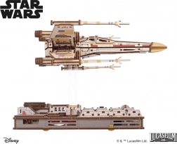 Modellen begejstrer med funktionelle detaljer: åbningsbar cockpit, aftageligt landingsstel, luge i skroget med knap i R2-D2-stil og især S-foil vinger, der kan skiftes til angrebsposition. Soklen drives af 3× AA-batterier eller USB-C-kabel (medfølger ikke). Samlingen foregår uden lim og værktøj.