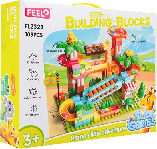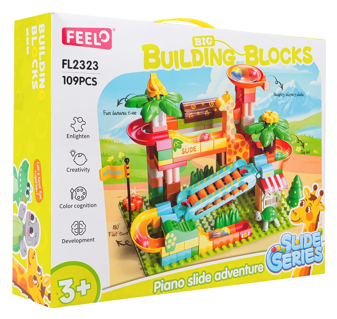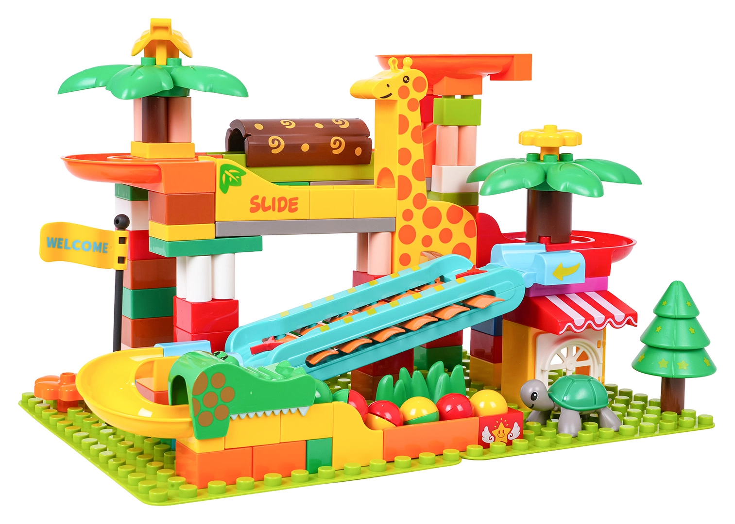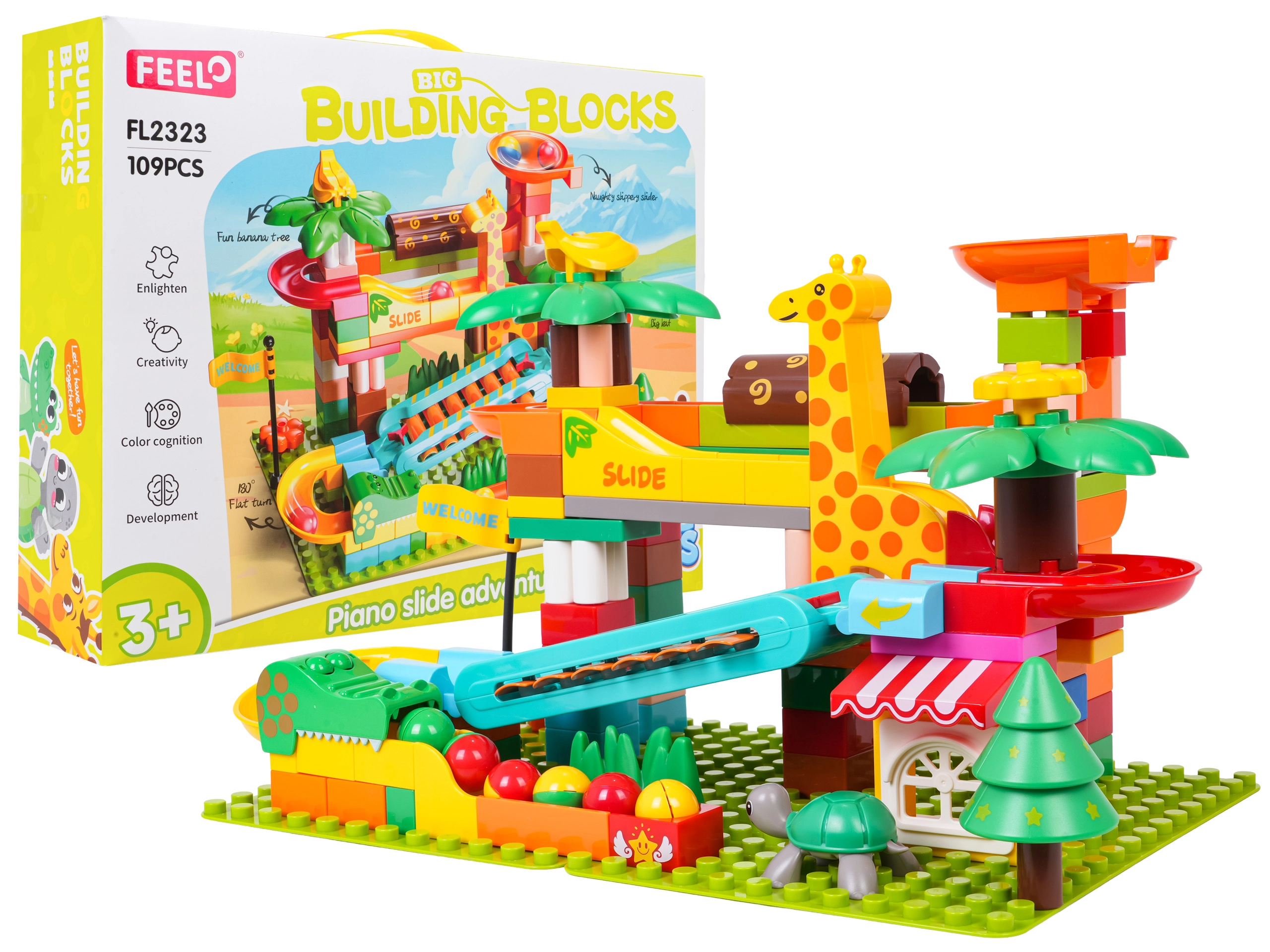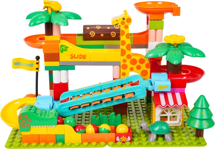 Dette kreative byggesæt bringer safari-stemning ind på børneværelset: palmer, dyr og et lille hus suppleres af en gennemtænkt kuglebane med rutsjebaner, tragte og et klaverelement – når kuglerne kører over klokkespillet, skaber de glade melodier. En stabil base og lette klikforbindelser giver nem bygning og leg.