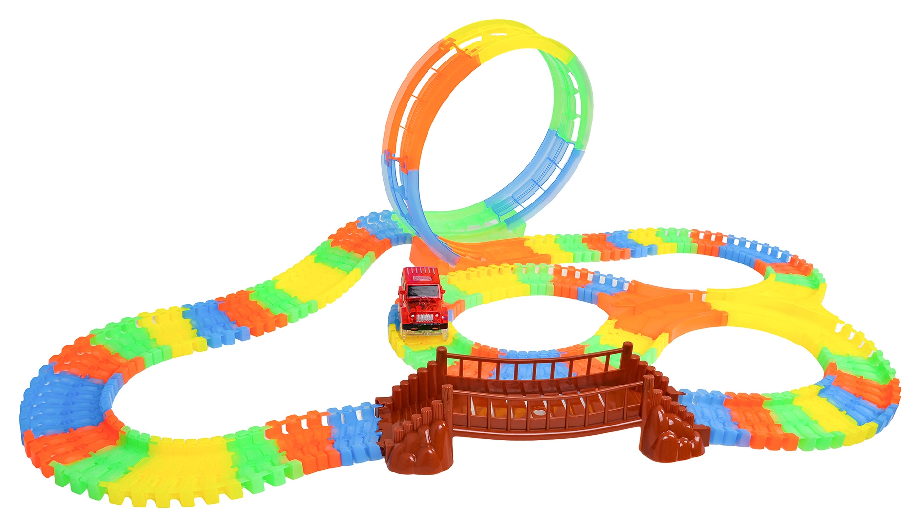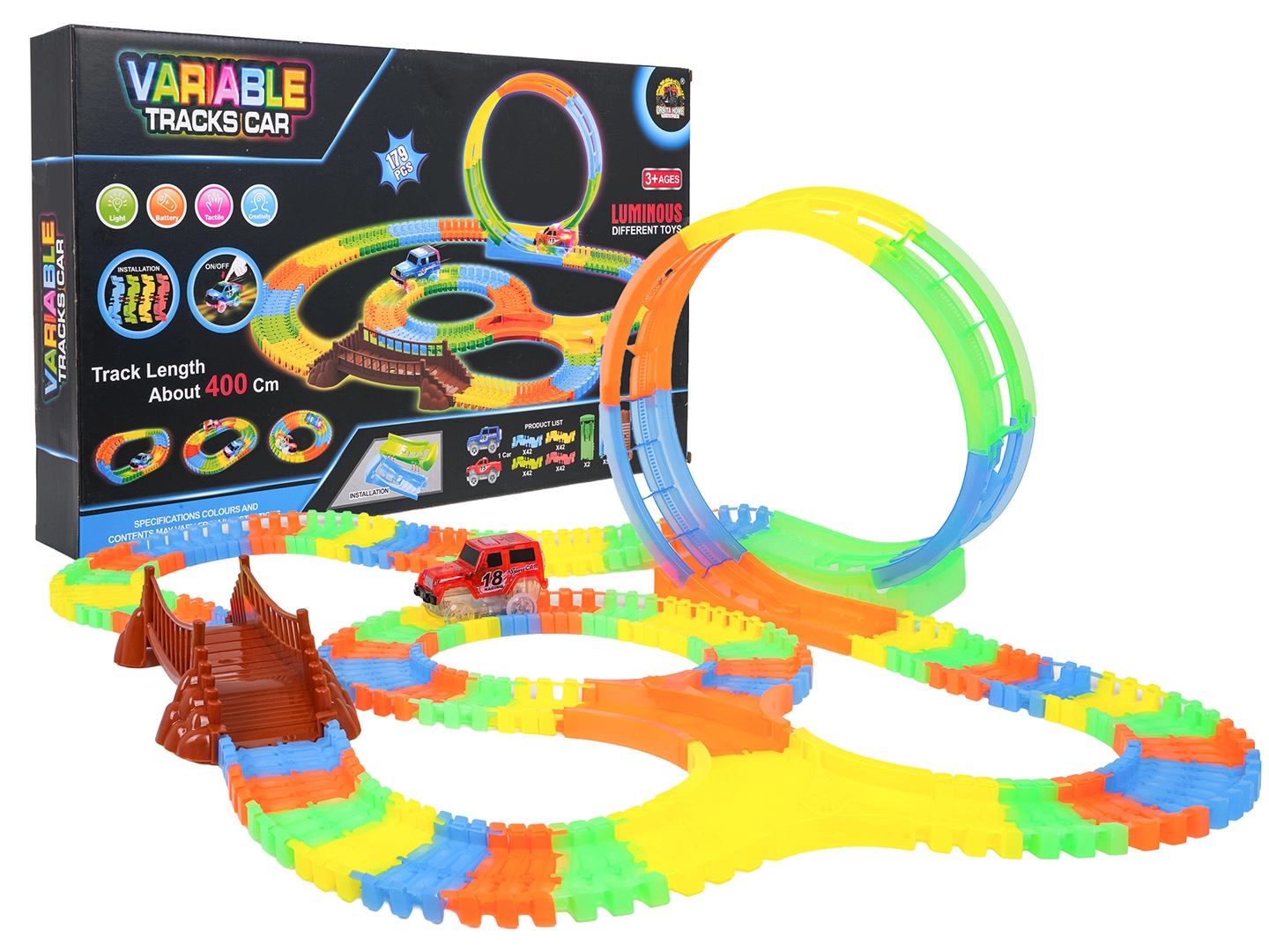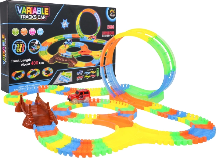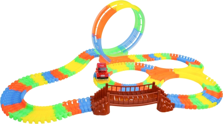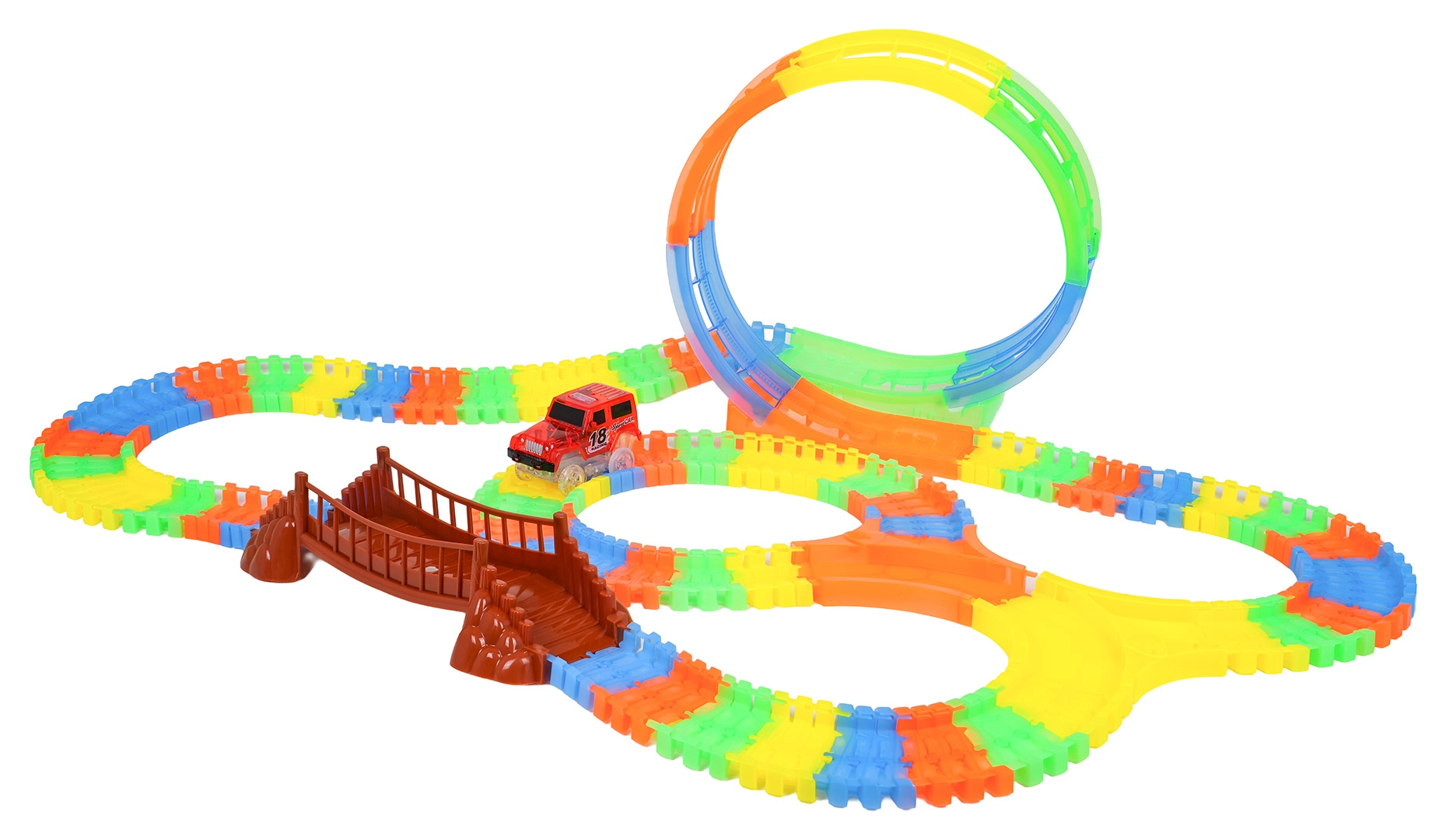 Denne farverige racerbane glæder børn fra 3 år. Med de fleksible segmenter bygger du lige stræk, sving, bro og et stort lodret loop – på ingen tid. Det fluorescerende design giver en glødende effekt i mørke, mens LED-bilen kører banen rundt og efterlader et lysende spor.