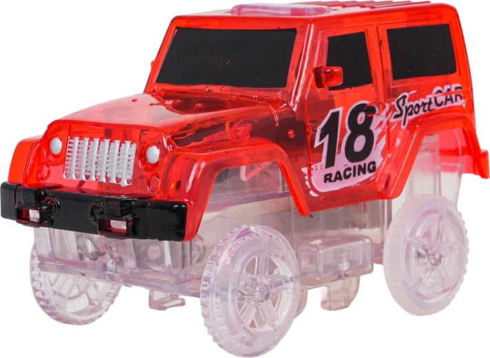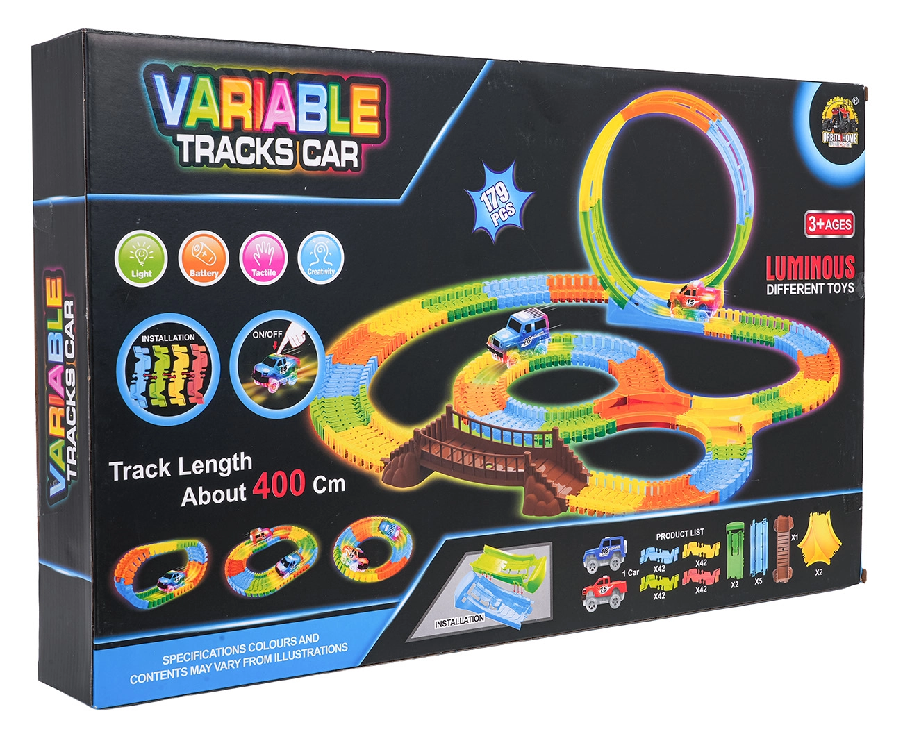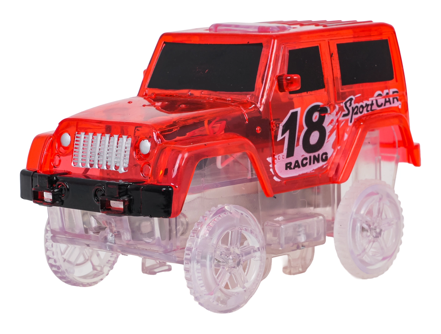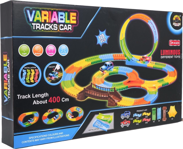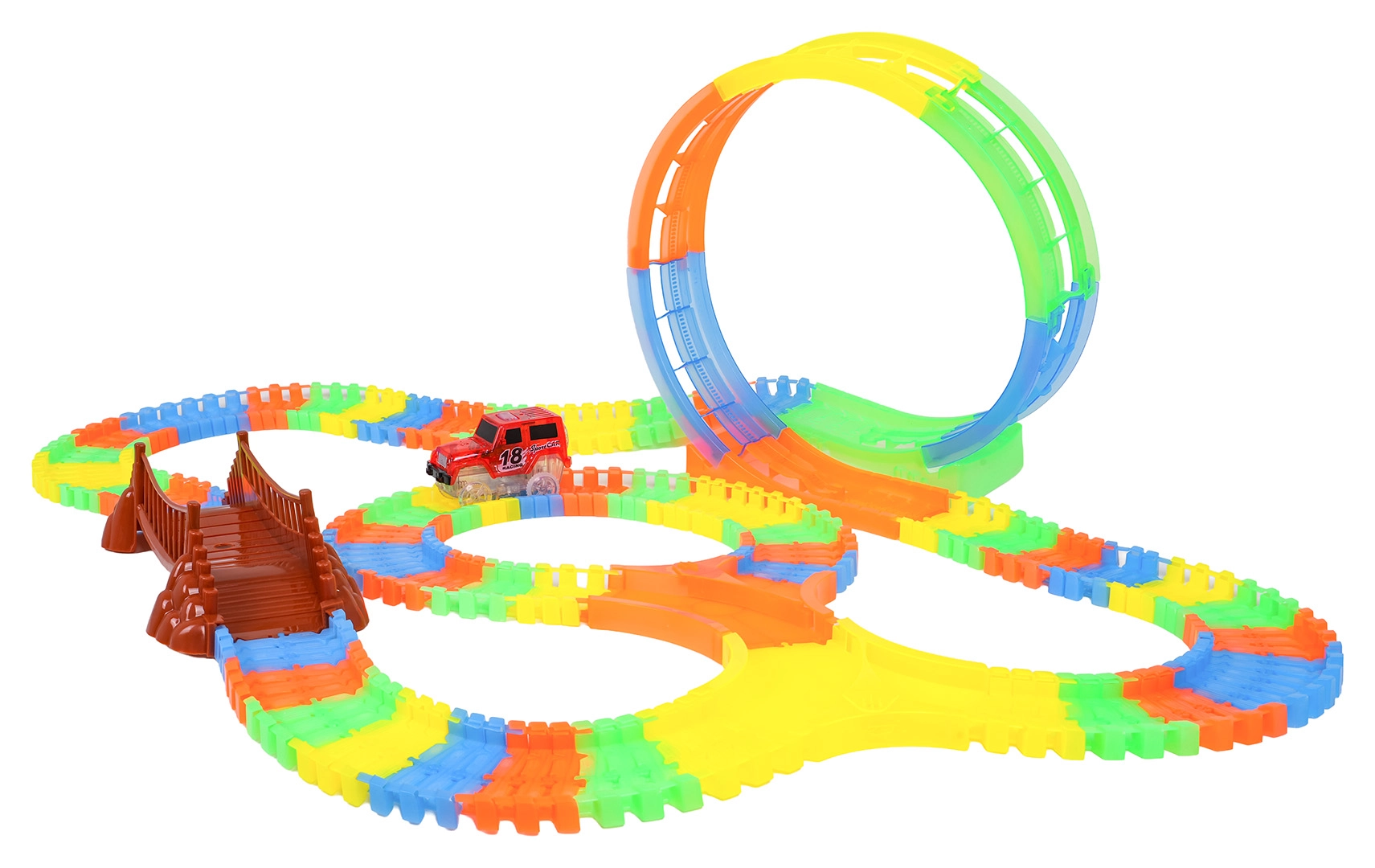 Denne farverige racerbane glæder børn fra 3 år. Med de fleksible segmenter bygger du lige stræk, sving, bro og et stort lodret loop – på ingen tid. Det fluorescerende design giver en glødende effekt i mørke, mens LED-bilen kører banen rundt og efterlader et lysende spor.