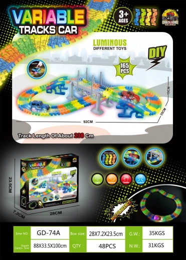 Skab din egen racerworld med VARIABLE-racerbanen på op til 238 cm. Delene er fleksible og lette at samle, så børn hurtigt kan ændre banen og eksperimentere med nye kombinationer. Det fluorescerende design gør, at de enkelte dele lyser i mørke, og bilens LED-lys forvandler køreturen til et lysshow.