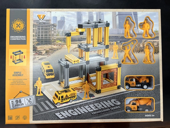 Sættet er lavet af holdbare og sikre materialer, egnet til børn fra 3 år. Indeholder alt til leg med det samme – fra dele til opbygning af byggepladsen, over 4 byggearbejder-figurer, til 2 metalbyggemaskiner med bevægelige elementer (gravko og kran).