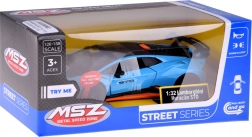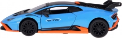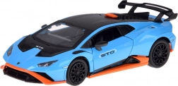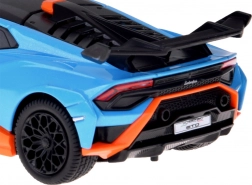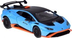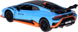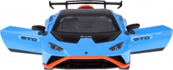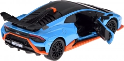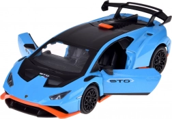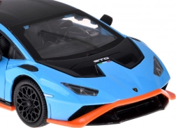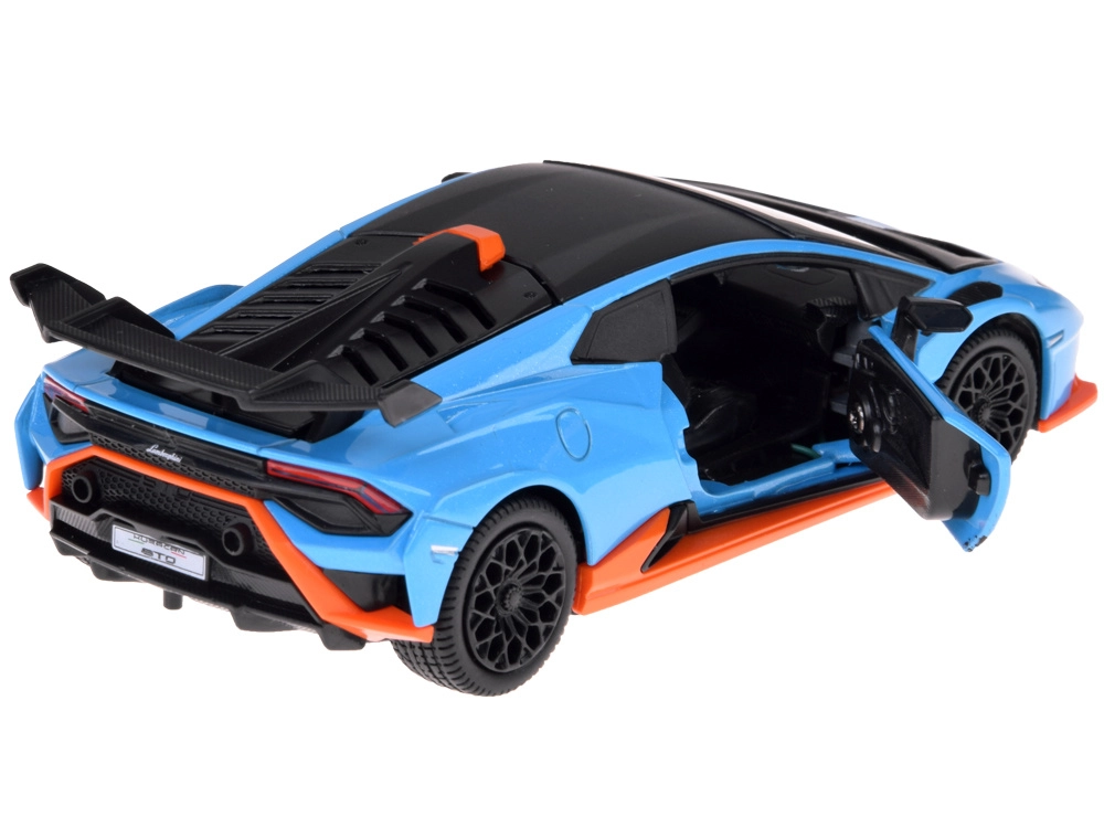 Denne detaljerede model af LAMBORGHINI Huracán STO i skala 1:32 glæder både børn og voksne fans af supersportsvogne. Metal karrosseri i blå metallic med sorte og orange accenter, trofaste linjer og en stor bagvinge understreger det autentiske look. Åbning af dørene aktiverer lys- og lydeffekter – lysene tændes, og motor- samt hornlyd høres.