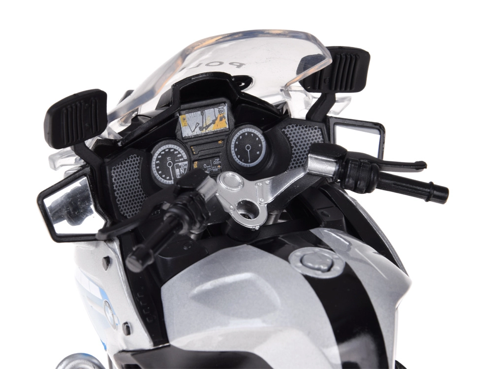 Styr, spejle, klart skjold og naturtro trykte instrumenter understreger det autentiske look af politimotorcyklen.