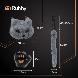 Vil du skille dig ud og udtrykke din stil? Dette grå RUHHY 4-i-1 sæt med maske, justerbar hale og bløde poter er det perfekte tilbehør til cosplay, fotoshoots og fester. Takket være den bløde kunstpels er det behageligt, let og iøjnefaldende, den elastiske rem og den formbare hale med tråd sikrer perfekt pasform. Komplet sæt klar til øjeblikkelig brug – forvandl dig til en mystisk kat, en charmerende ræv eller en vild ulv.