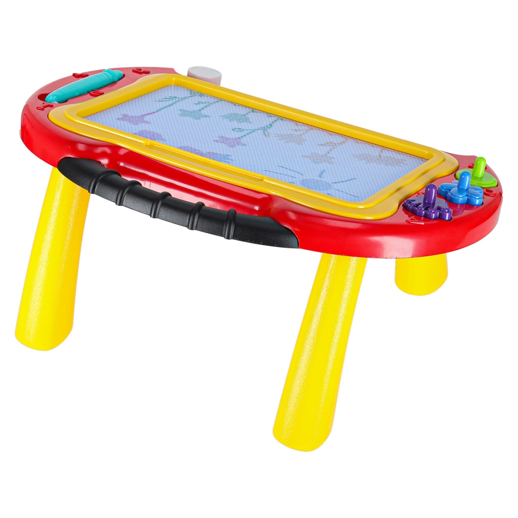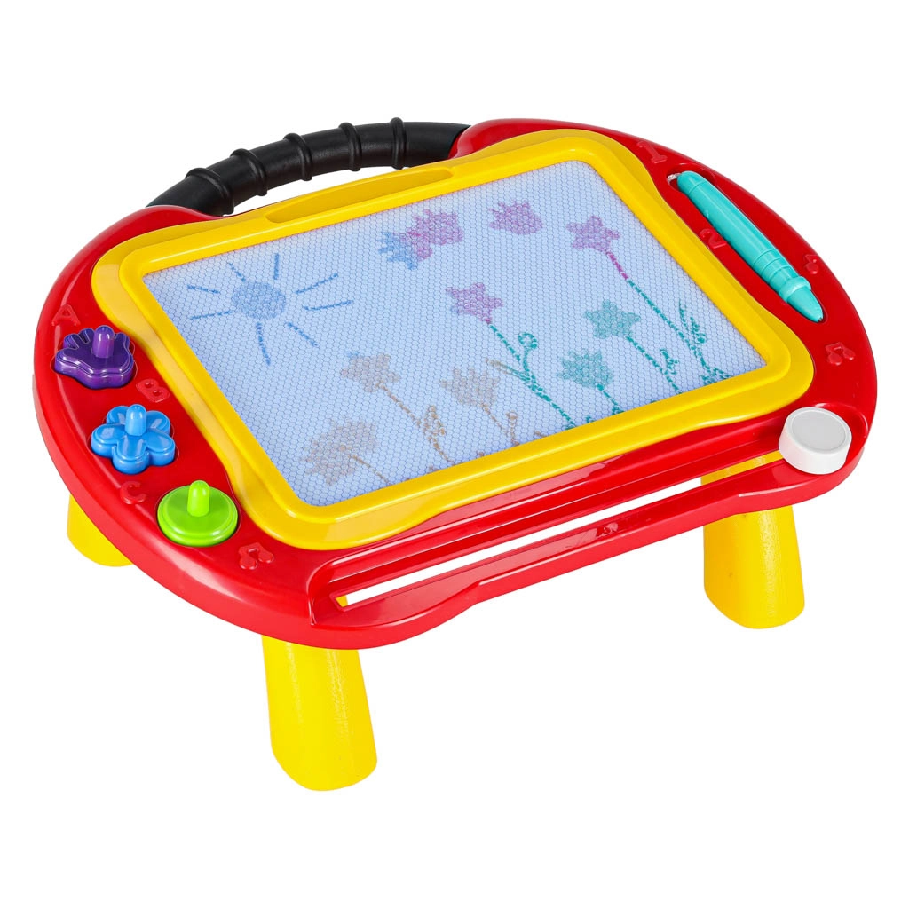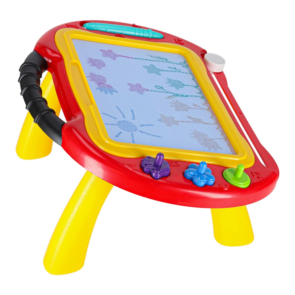 Skærmen viser 4 farver til livlige billeder, der renses med én bevægelse af slette-skyderen. Stylus på snor bliver ikke væk, og de aftagelige ben gør det muligt at lege overalt – på børneværelset, i stuen og på farten.