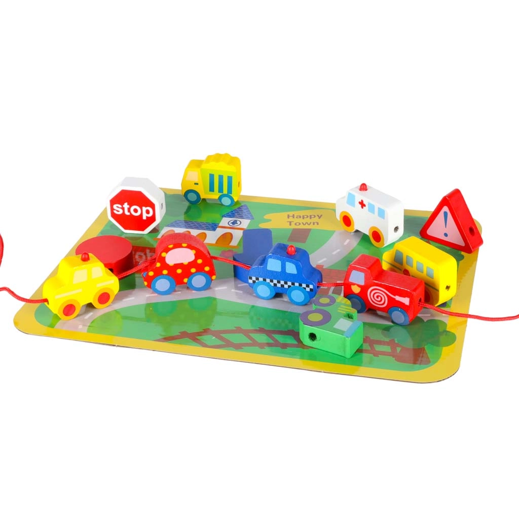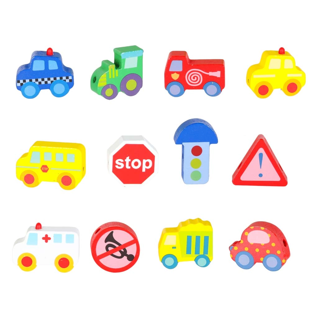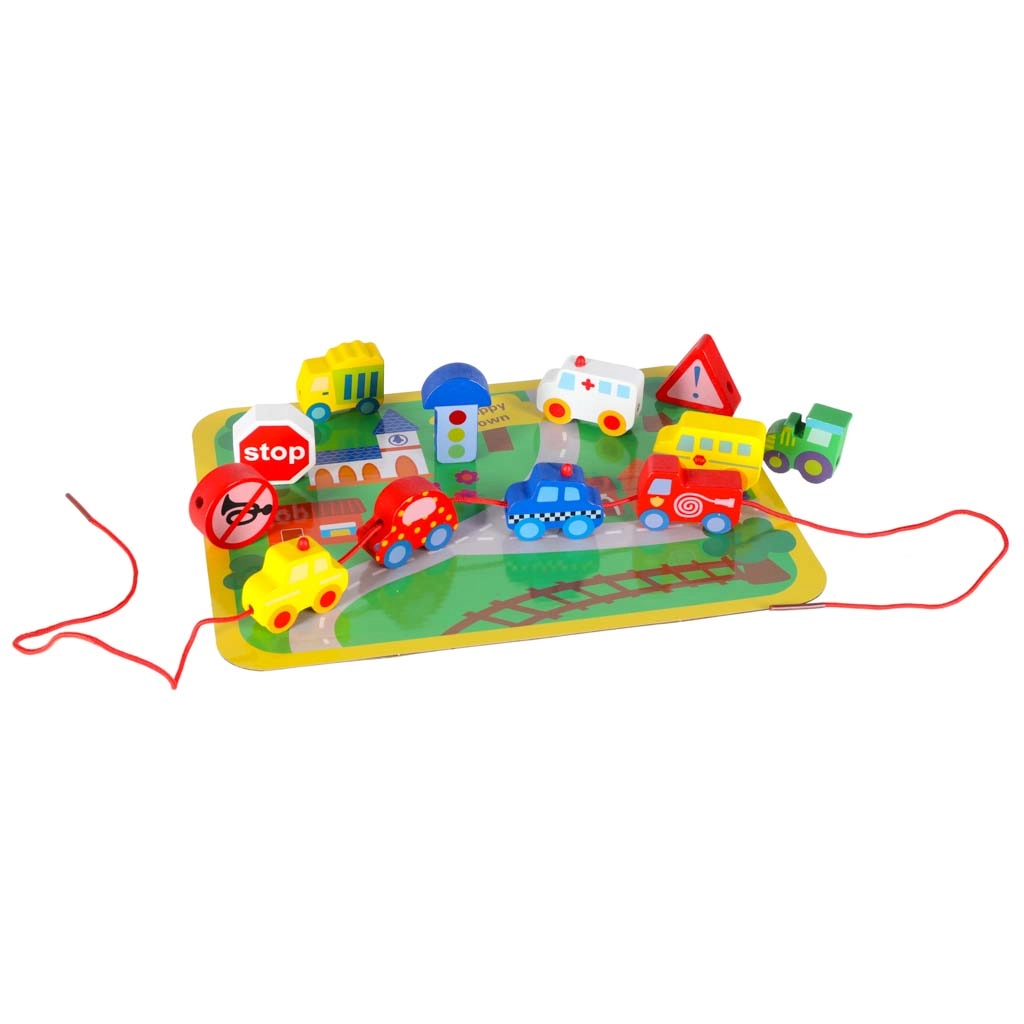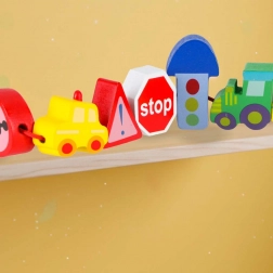 Massive, glat forarbejdede klodser i form af køretøjer og skilte er lette at gribe og kan nemt trækkes på snoren via gennemgående huller.