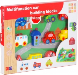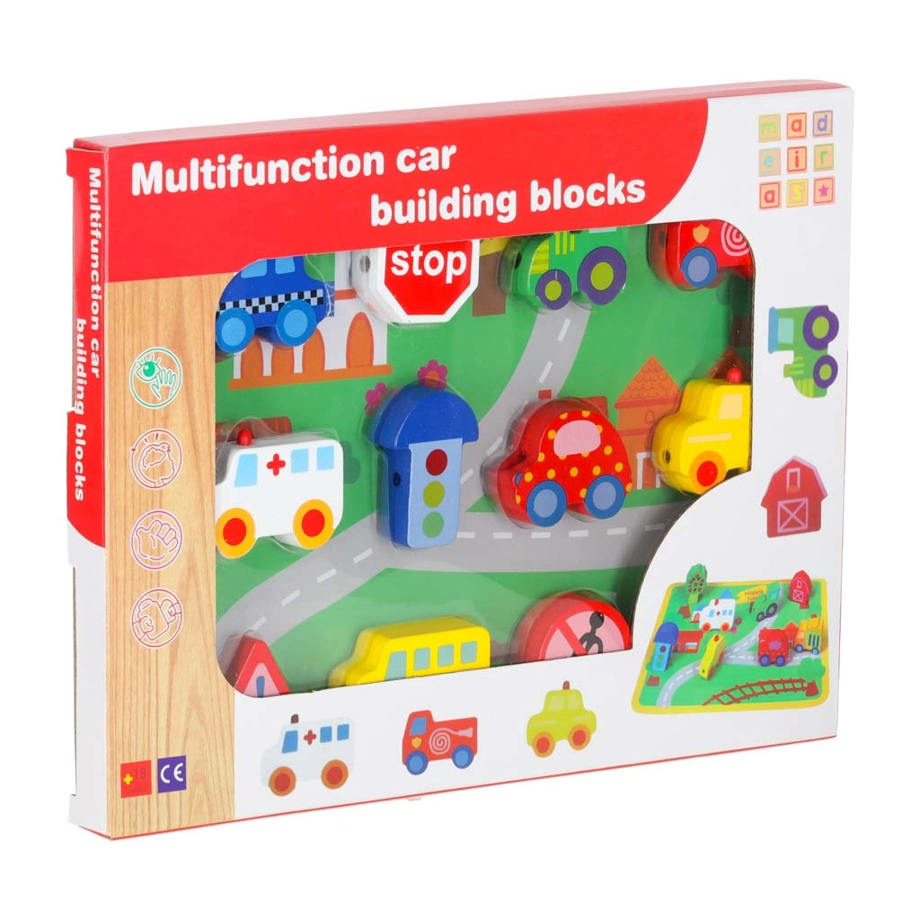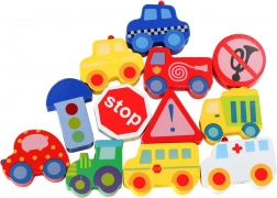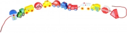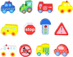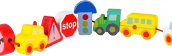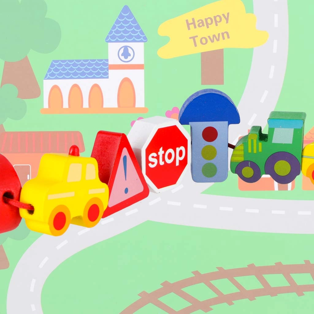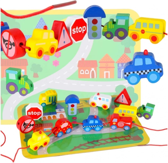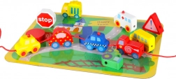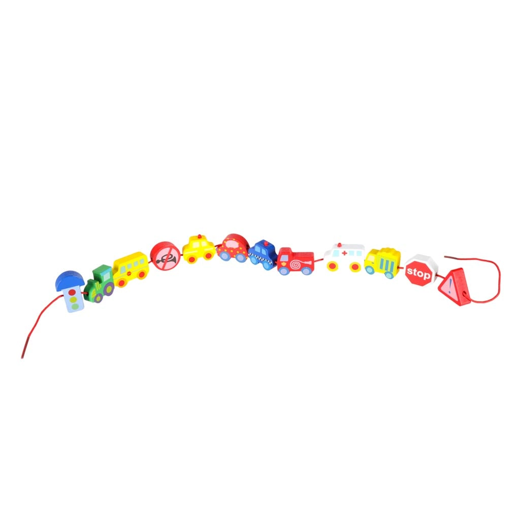 Massive, glat forarbejdede klodser i form af køretøjer og skilte er lette at gribe og kan nemt trækkes på snoren via gennemgående huller.