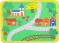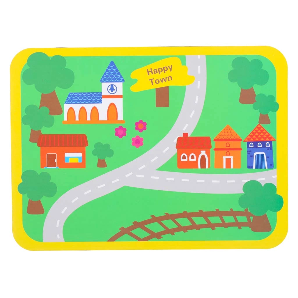 Det farverige underlag med veje og bygninger stimulerer fantasien og lærer trafiksituationer, ideelt til både selvstændig og fælles leg.