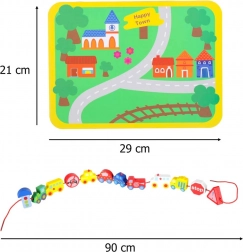 Dette kreative sæt kombinerer snøring af træklodser med fri leg på underlaget “lille by”. Børn øver greb, bevægelsespræcision og tålmodighed, mens de lærer at kende biler, ambulance, bus, politi og trafikskilte. Delene er glat forarbejdede, behagelige at røre ved og sikkert farvede.
