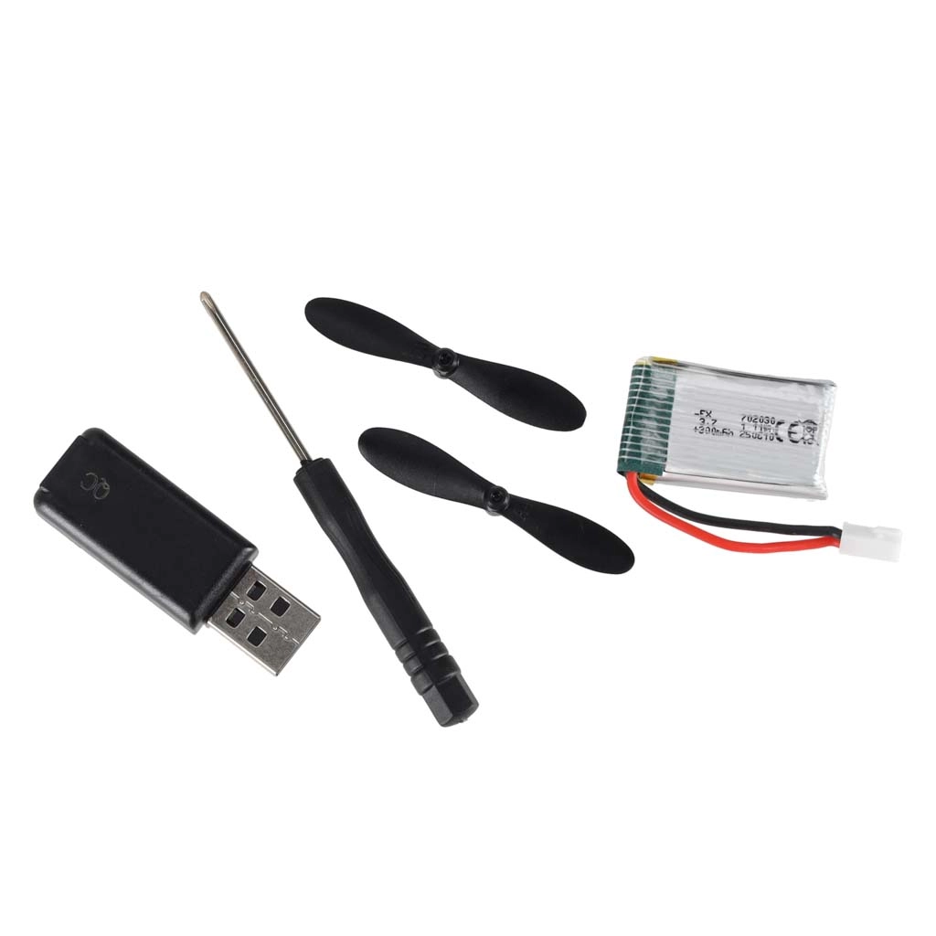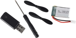 Modellen tilbyder to startmetoder – håndkast og takeoff fra jorden takket være det robuste landingsstel. I pakken finder du alt, hvad du skal bruge for at flyve, inklusive et 3,7 V 300 mAh batteri, USB-oplader og reservepropeller. Controllerens rækkevidde er cirka 100 meter, opladningstid omkring 60 minutter og flyvetid cirka 12 minutter.