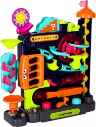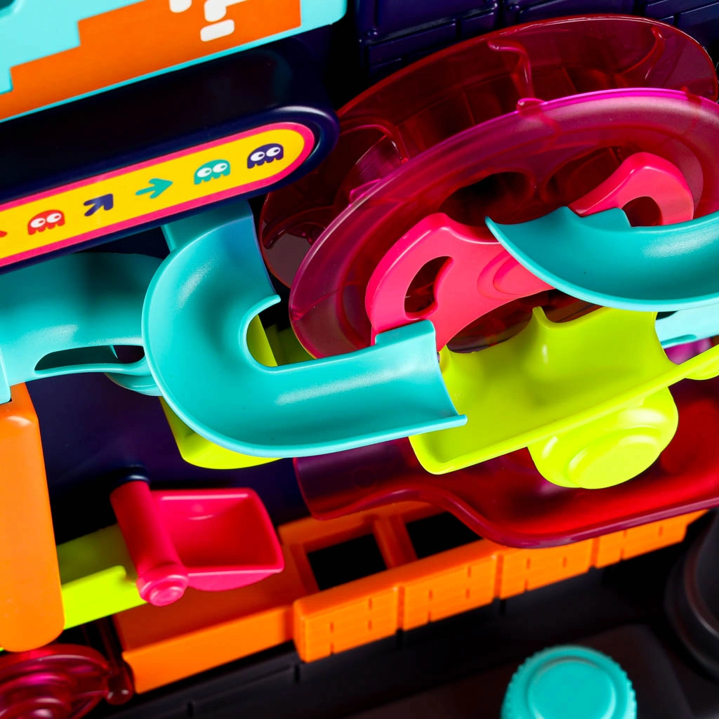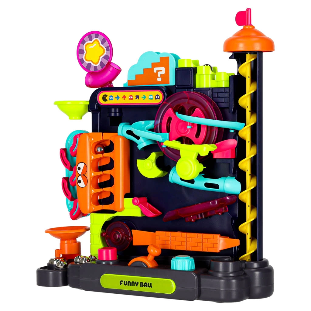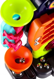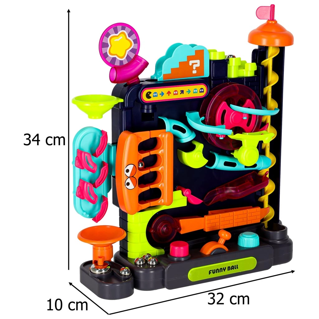 Takket være den robuste plastkonstruktion, den stabile base og den overskuelige banestruktur er legen let tilgængelig selv for mindre børn. Sættet inkluderer 6 metalkugler, som nemt kan sættes i gang og gentagne gange føres tilbage til start. De mange ruter og bevægelige dele fremmer kreativitet, logisk tænkning og koncentration.