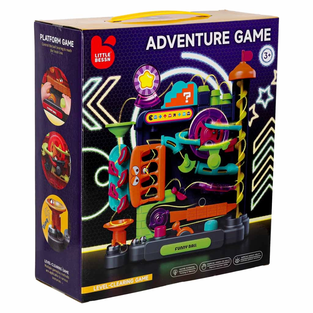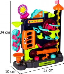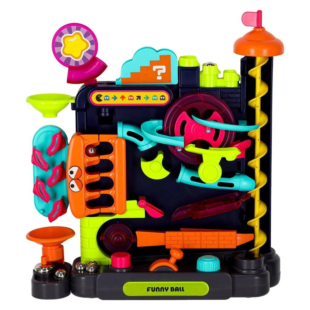 Denne farverige kuglebane tilbyder børn fra 3 år en spændende rejse fuld af ramper, spiraler og interaktive elementer. Styr banen med håndtag og drejeknapper, se kuglerne passere forhindringerne, og træn koordination og tålmodighed. Ideel til sjov derhjemme og til enkle fysiske eksperimenter med tyngdekraft.
