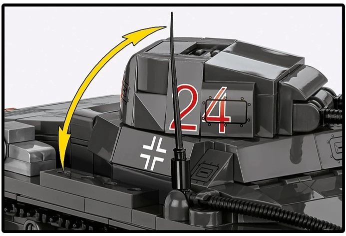 Et 360° drejeligt tårn, justerbar bevæbning og realistiske bælter med hjul muliggør dynamiske scener, jævn bevægelse og en attraktiv præsentation af modellen.