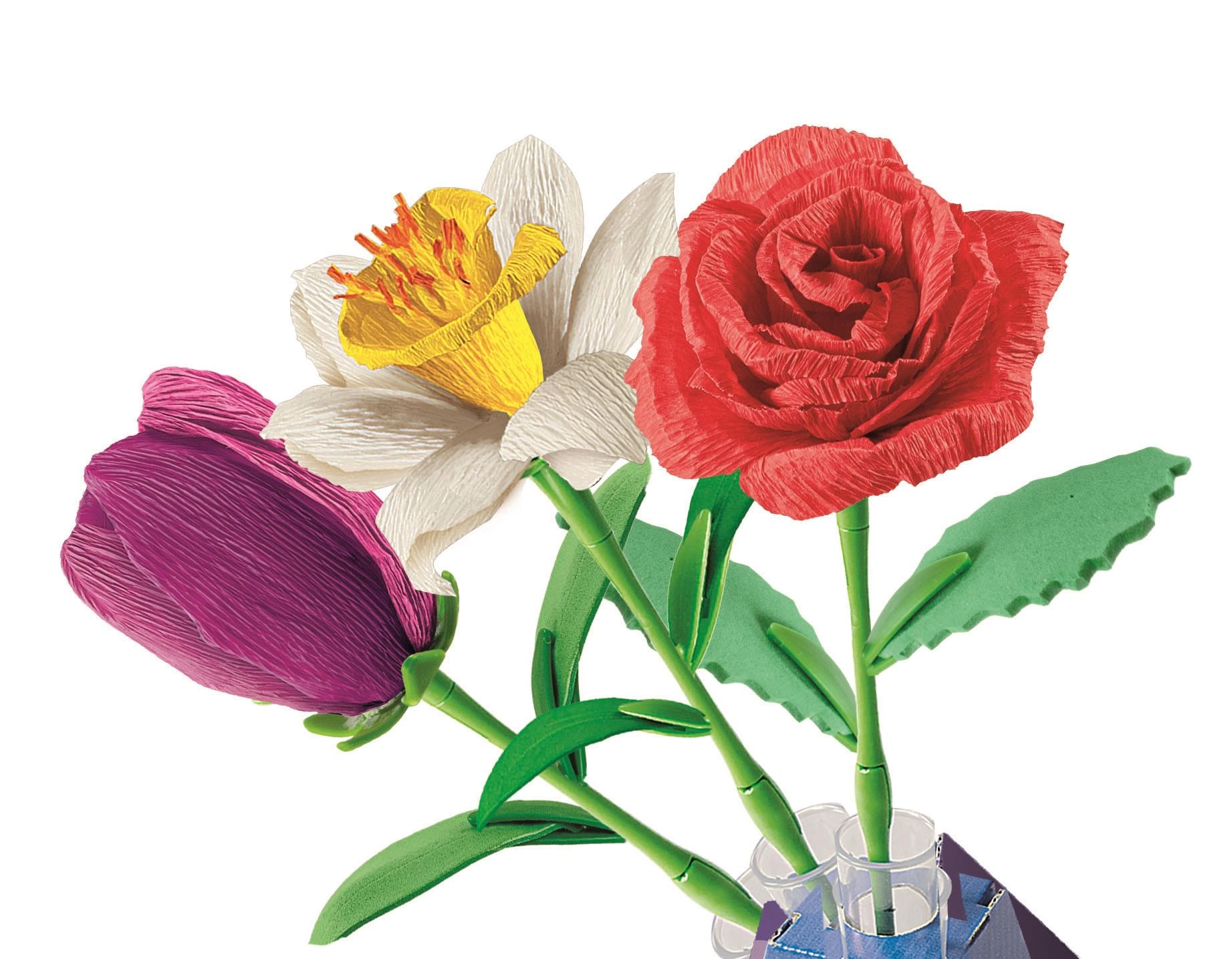 - Komponenter til samling af blomster (stilke, kronblade, blomsterhoveder), personaliserbar urtepotte i karton