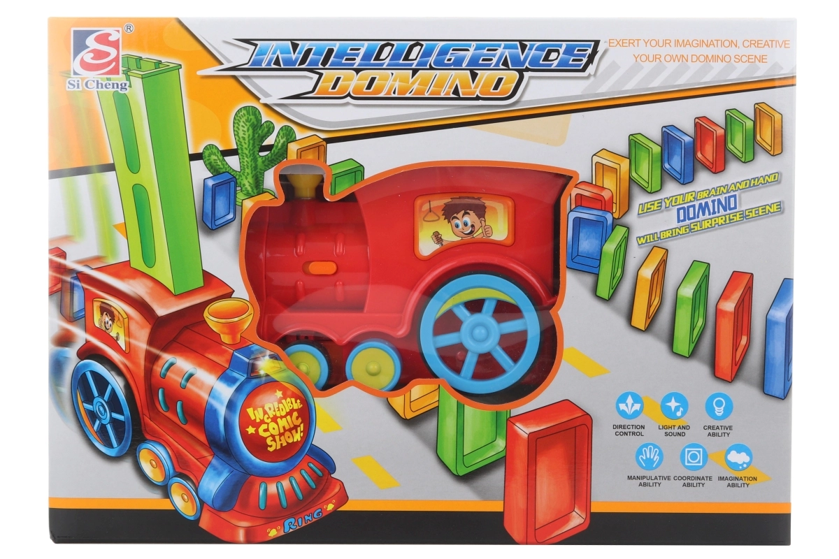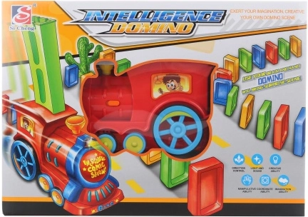 Dette røde domino-tog er det ideelle legetøj til små byggere. Når magasinet med dominobrikker er sat på, lægger toget automatisk domino under kørsel og placerer dem i en lige linje. Legen ledsages af lys og klirren, hvilket gør den endnu sjovere. Ved sammenstød med en forhindring skifter toget retning og fortsætter.