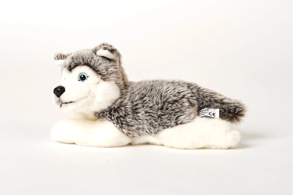 En sød, plysset husky i liggende position, 23 cm lang, vil glæde både små og store dyreelskere. Den er lavet af et behageligt materiale og er egnet allerede fra 0+. Denne miljøvenlige bamse er ideel til at kramme, lege med eller som pynt på børneværelset.