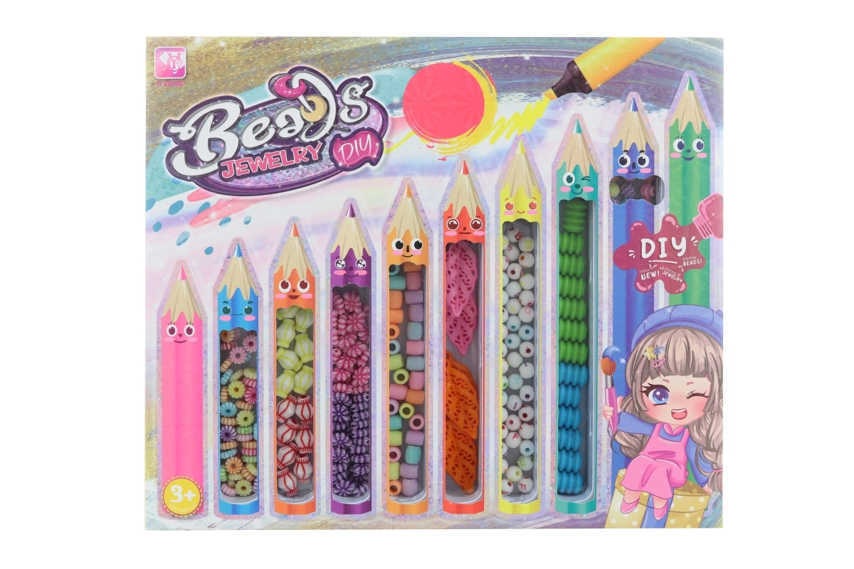 Støt børns fantasi og tålmodighed med et farverigt perlesæt i en original æske formet som blyanter. Takket være de mange former og størrelser kan børn nemt lave halskæder, armbånd og vedhæng, mens de udvikler finmotorik og kreativitet.