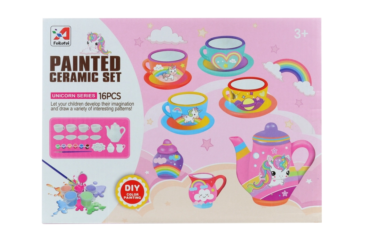 Skab dit eget magiske tesæt med enhjørninge! Dette keramiske malersæt indeholder alt, hvad børn behøver for at skabe: 4 kopper og 4 underkopper, en kande, en sukkerskål, en mælkekande, en pensel, en palet og 6 farver. En fantastisk kreativ pakke for børn fra 3 år, som udvikler fantasi og finmotorik.