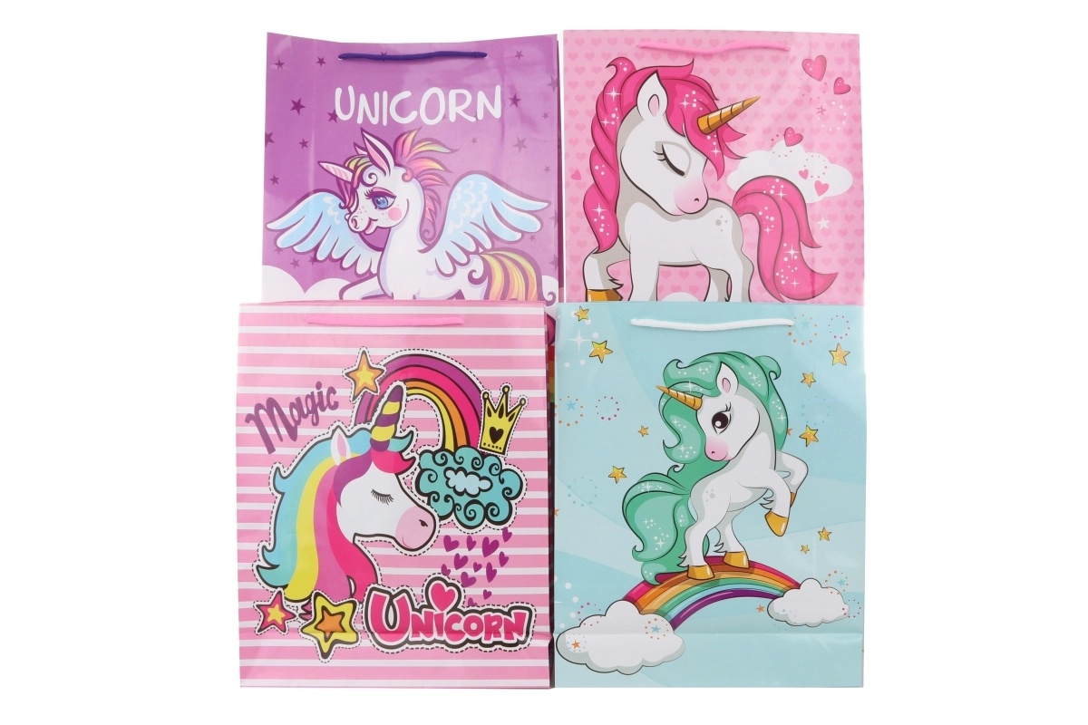 Stilfuld gavepose med et magisk enhjørningemotiv til enhver lejlighed. Ideel til indpakning af både fødselsdags- og højtidsgaver. Takket være målene ca. 32 × 26 × 9 cm rummer den nemt forskellige typer gaver og virker elegant og legende.