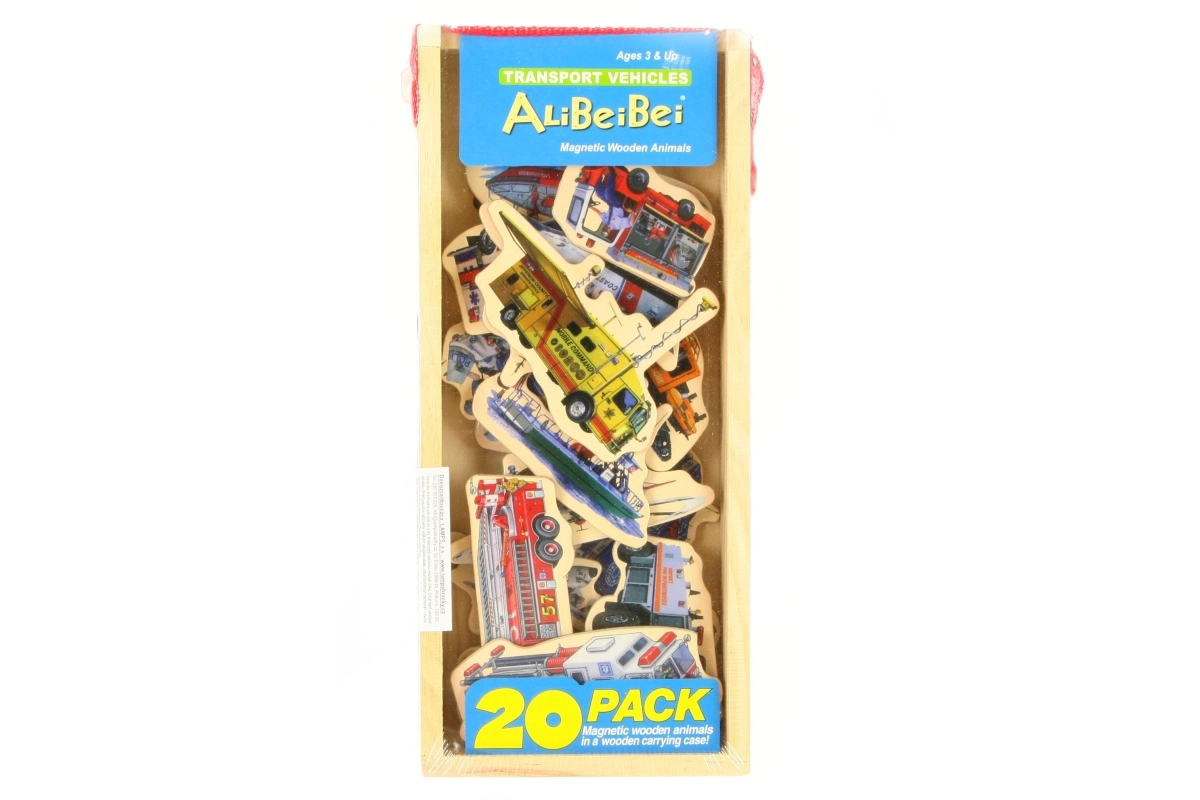 Magneterne er lavet i børnevenlige mål og sidder sikkert fast på metaloverflader. Den praktiske trææske med gennemsigtigt låg holder alle dele samlet, og takket være håndtaget er den nem at bære – perfekt både hjemme og på farten.