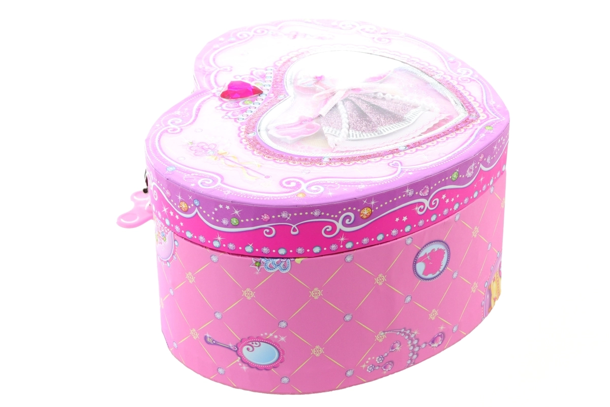 Skrinet tilbyder sikker opbevaring af ringe, armbånd og små skatte. Det er lavet af holdbart materiale med dekorative prinsessemotiver, har et låg med gennemsigtigt lille hjerte og en pålidelig lukning. Et fremragende gaveidé til balletelskere og dem, der værdsætter fine detaljer.