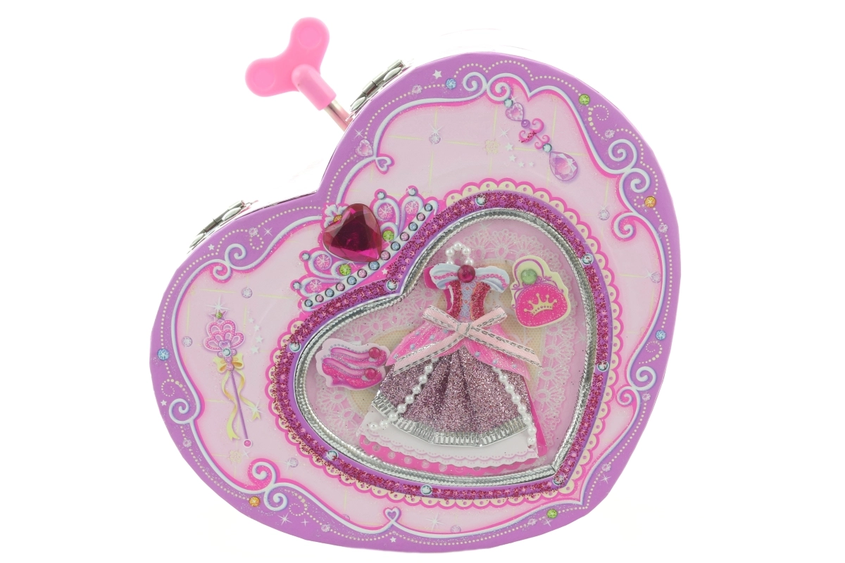 Metal konstruktion med prinsessemotiver, gennemsigtigt lille hjerte i låget og sikker lukning til tryg opbevaring af småting.