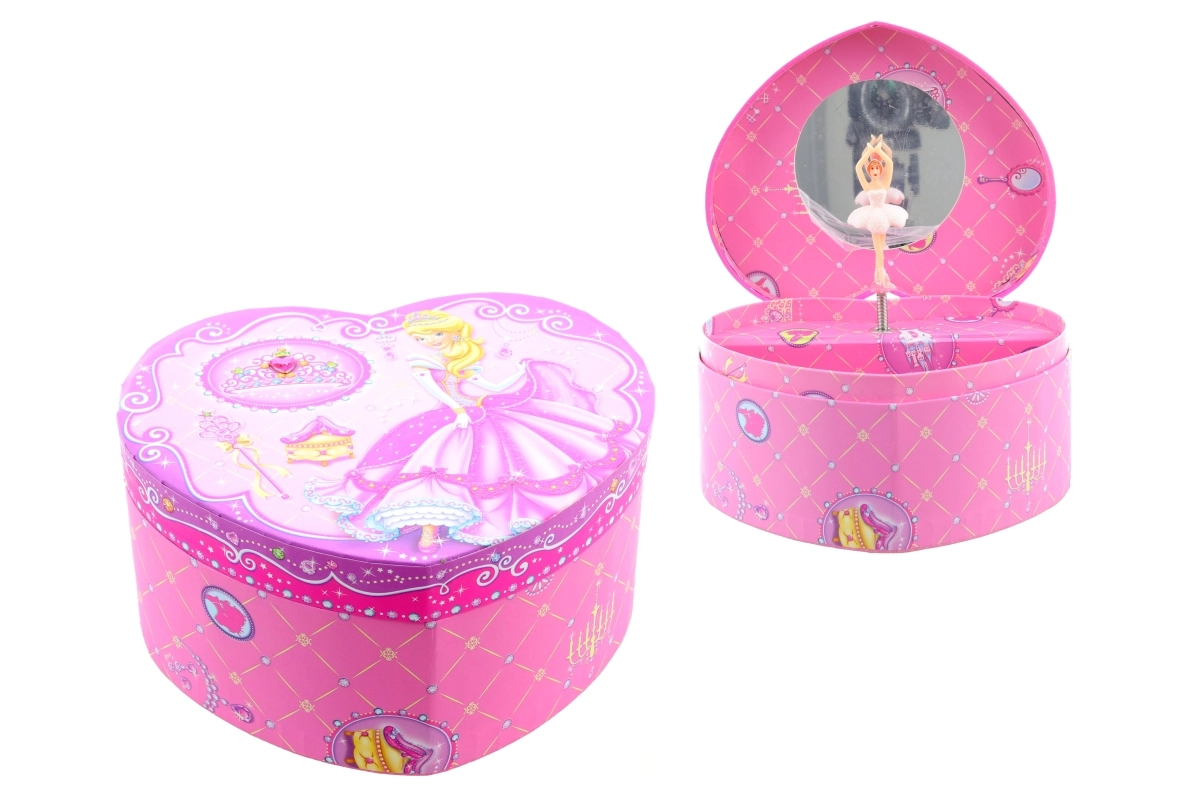 Dette charmerende smykkeskrin i lyserød prinsessestil er ideelt til opbevaring af ringe, øreringe og andre småting. Når det åbnes, snurrer balletdanseren foran det runde spejl, og en behagelig melodi skaber en magisk stemning.
