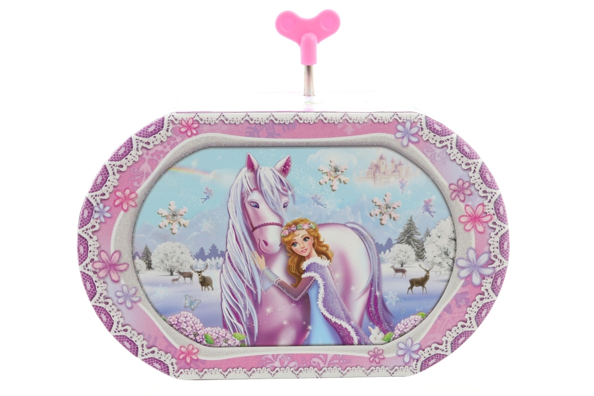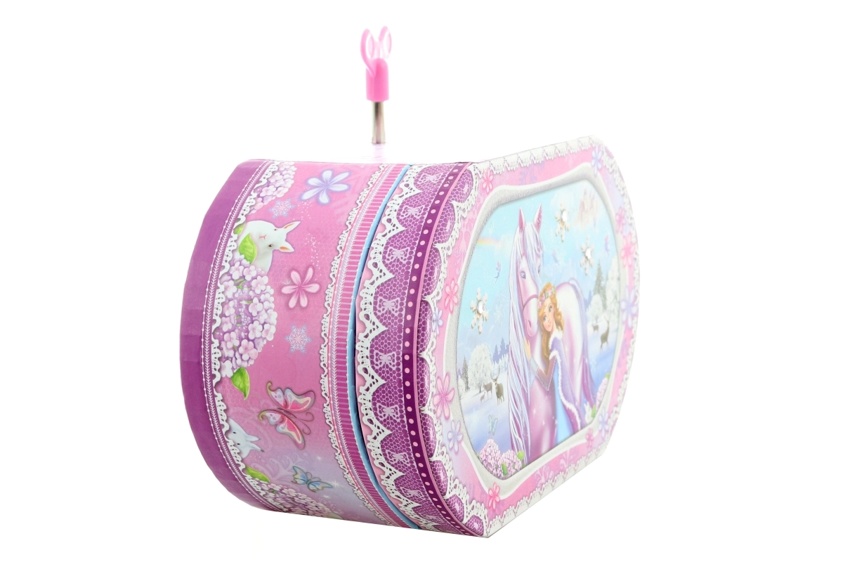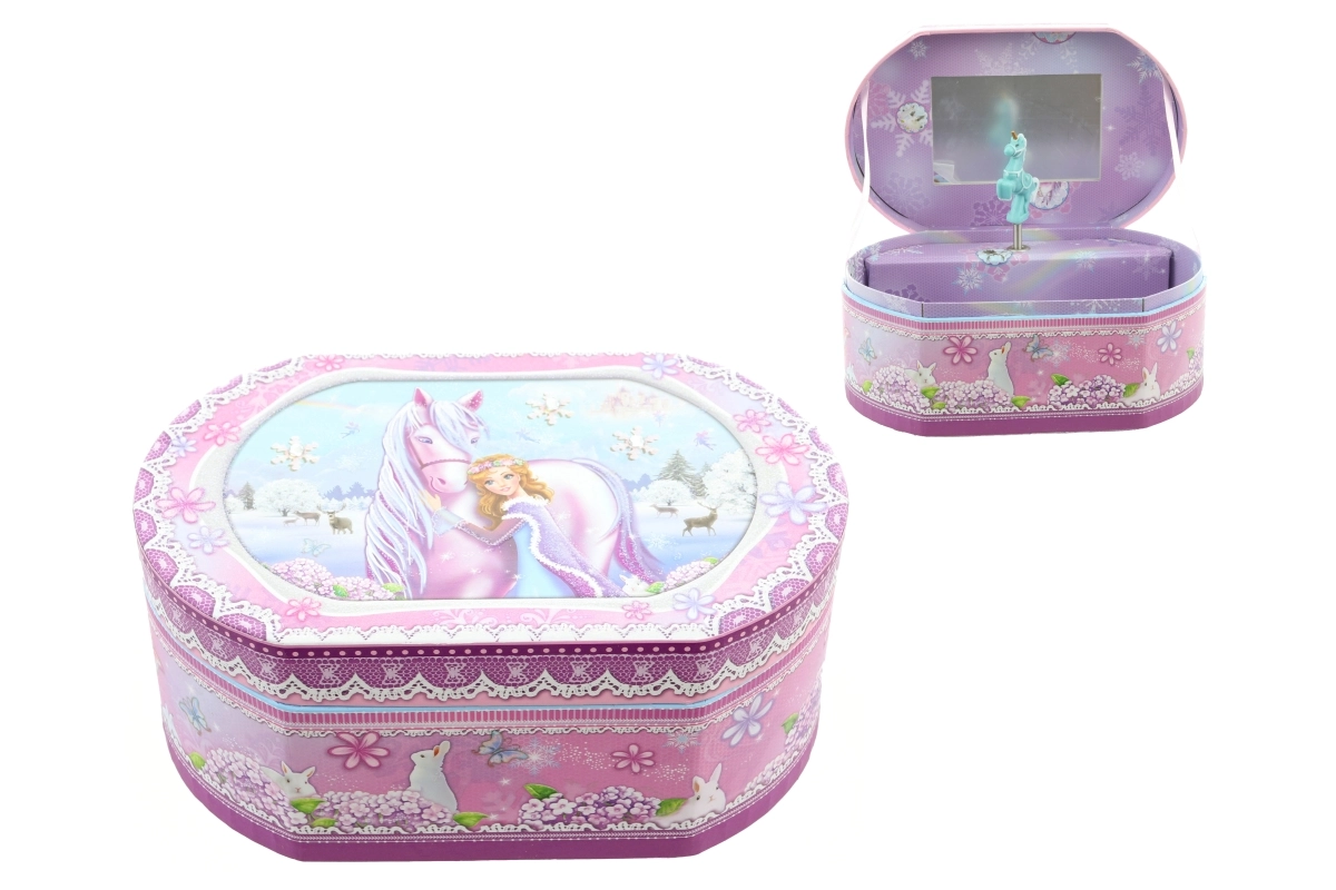 Dette fine musikalske smykkeskrin med motiver af enhjørning og prinsesse forvandler opbevaring af ringe, øreringe og små skatte til et magisk ritual. Når nøglen trækkes op, snurrer ballerinaen indeni, og en behagelig melodi spiller, mens det integrerede spejl gør det nemt at prøve smykker.