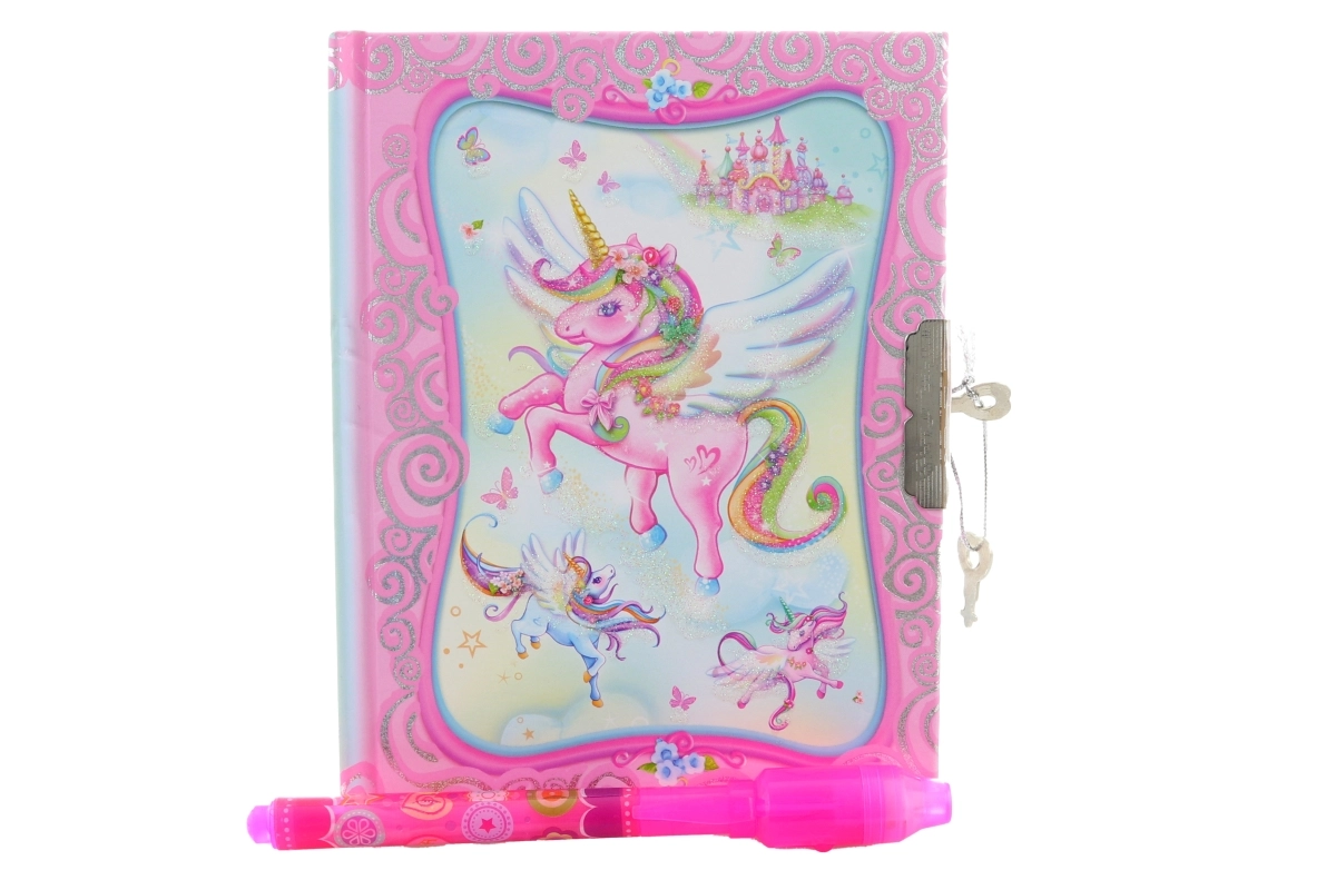 Opdag en verden af hemmeligheder med en original dagbog med enhjørningemotiv. Den specielle pen med usynligt blæk gør det muligt at skrive beskeder, der kun er synlige under UV-lys integreret i pennen. Ideel til dagbogsnoter, hemmelige beskeder og sjov skrivning med veninder.