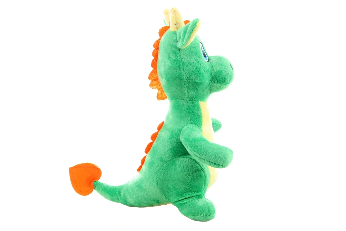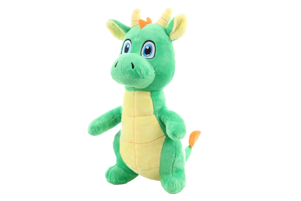 Denne grønne plysdrage med kontrastfarvet mave og charmerende detaljer bliver hurtigt en favorit hos hvert barn. Takket være den bløde overflade og fyldige polstring er den ideel til beroligende kram og blid leg i løbet af dagen.