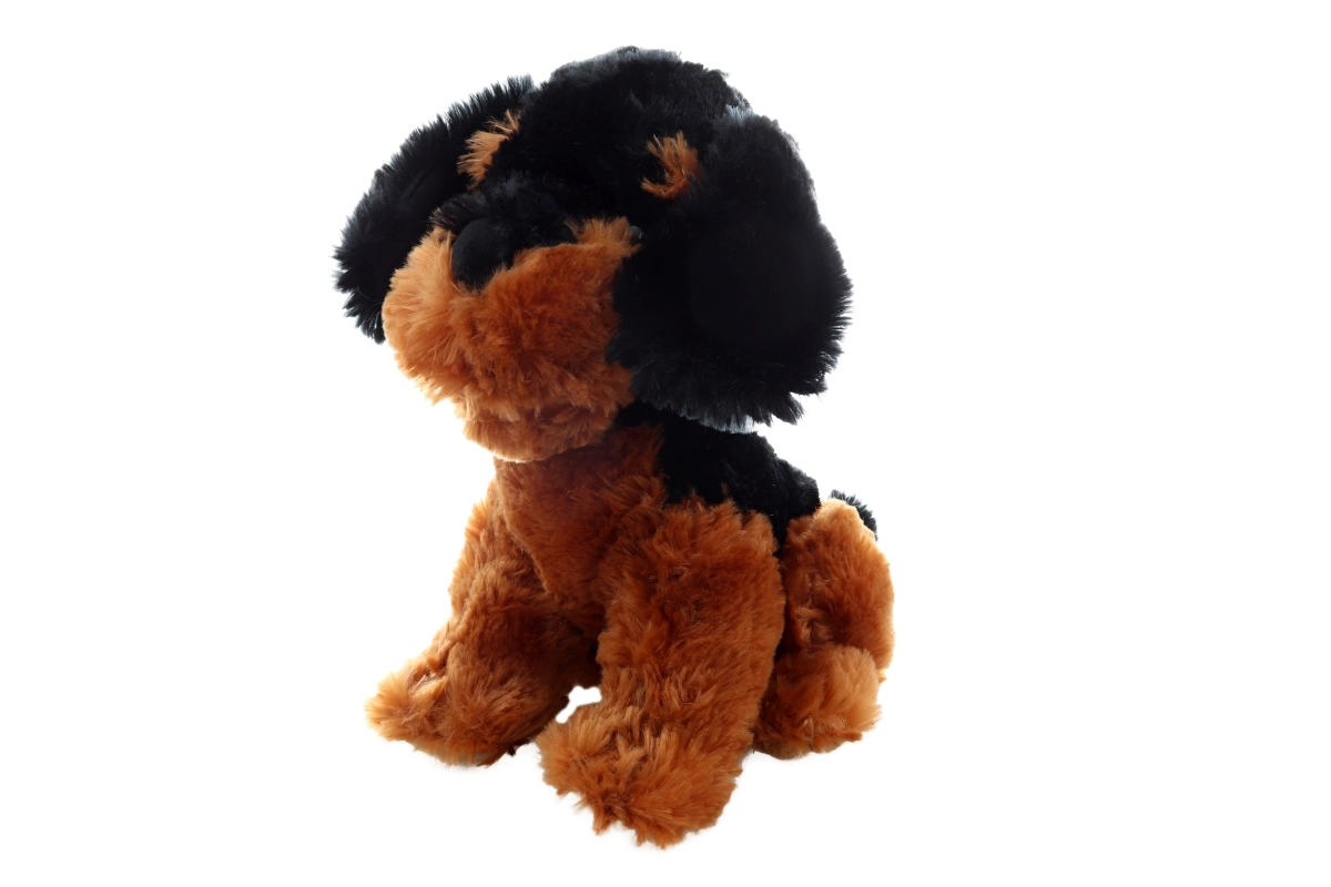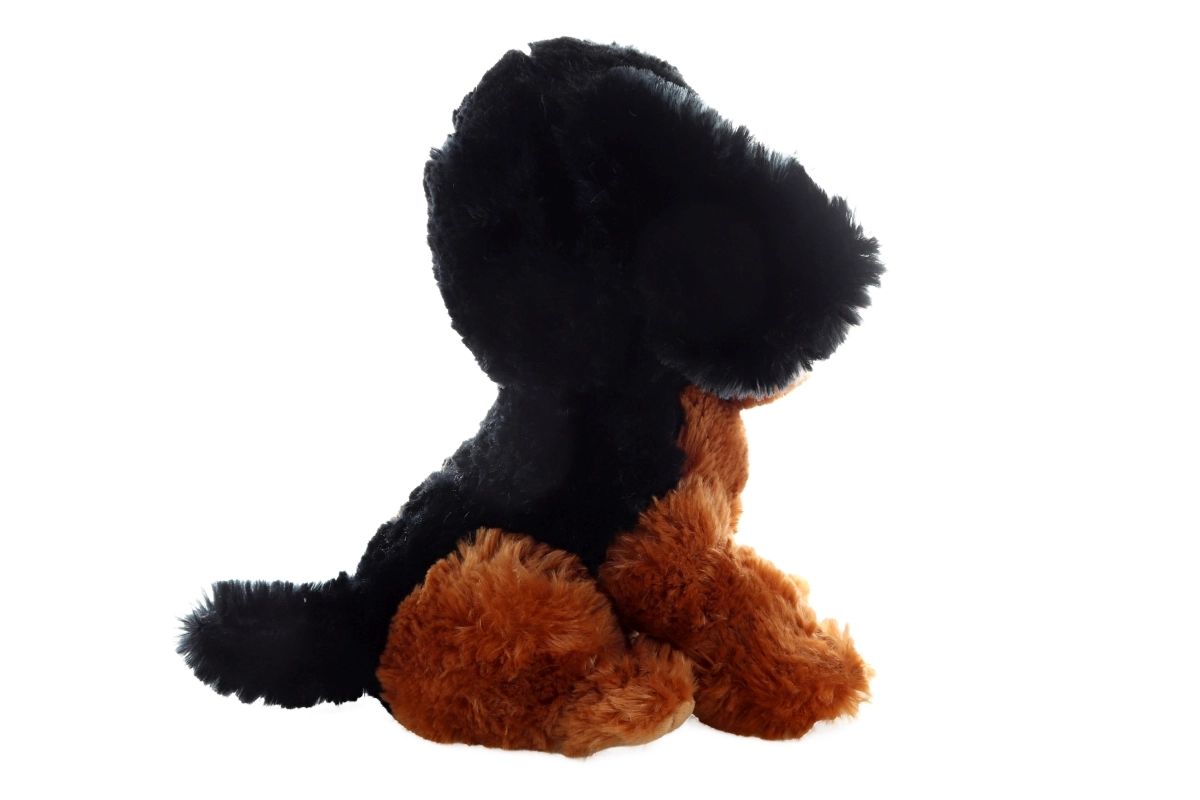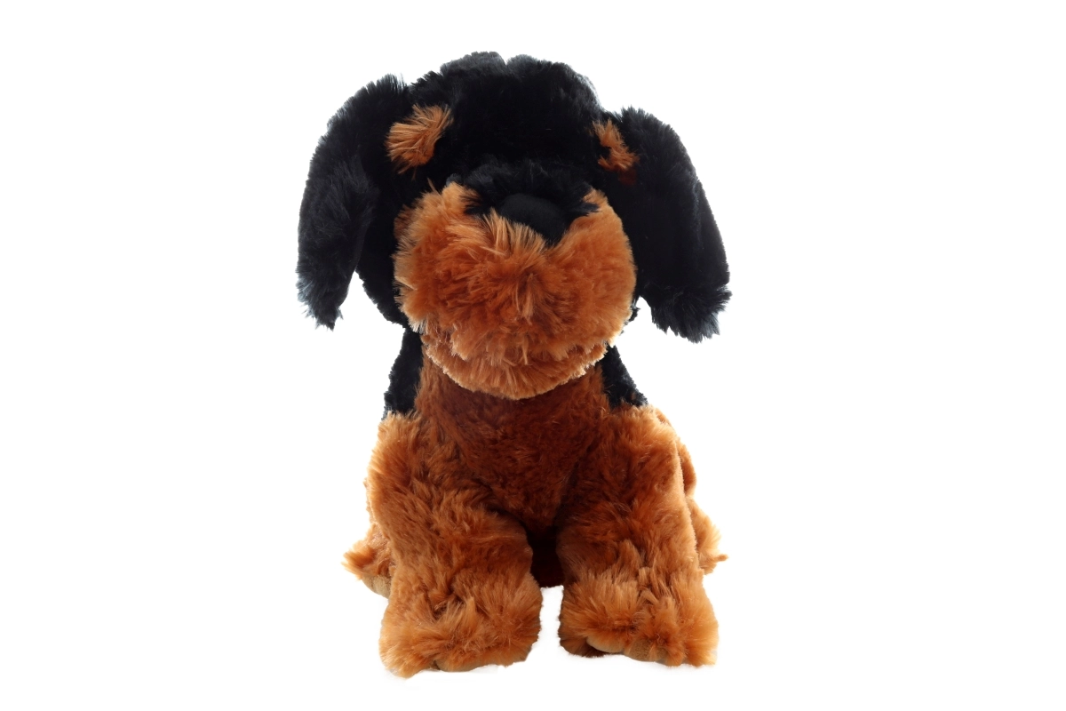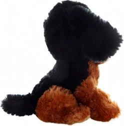 Denne mørke plyshund i siddende position charmerer med sin bløde, luftige pels og venlige udtryk. Den er lavet af materialer i høj kvalitet, som er behagelige at røre ved, indbyder til kram og giver komfort ved sengetid.