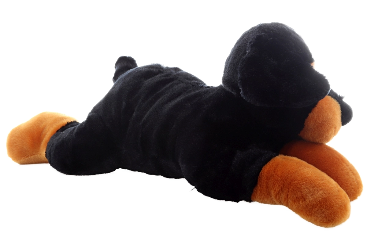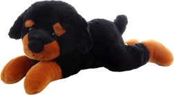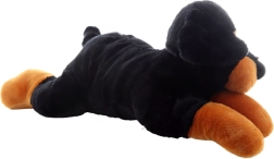 Denne plyshund i realistisk farvekombination med sort pels samt brune poter og snude er klar til uendelige kram. Takket være den bløde overflade og den kvalitetsfyld er den behagelig at røre ved og tilpasser sig barnets favn.