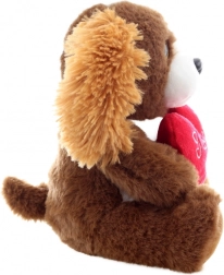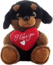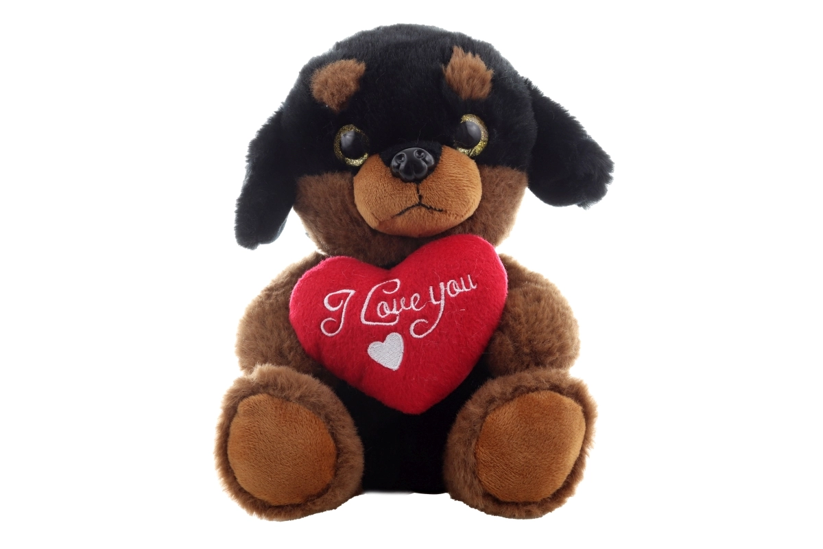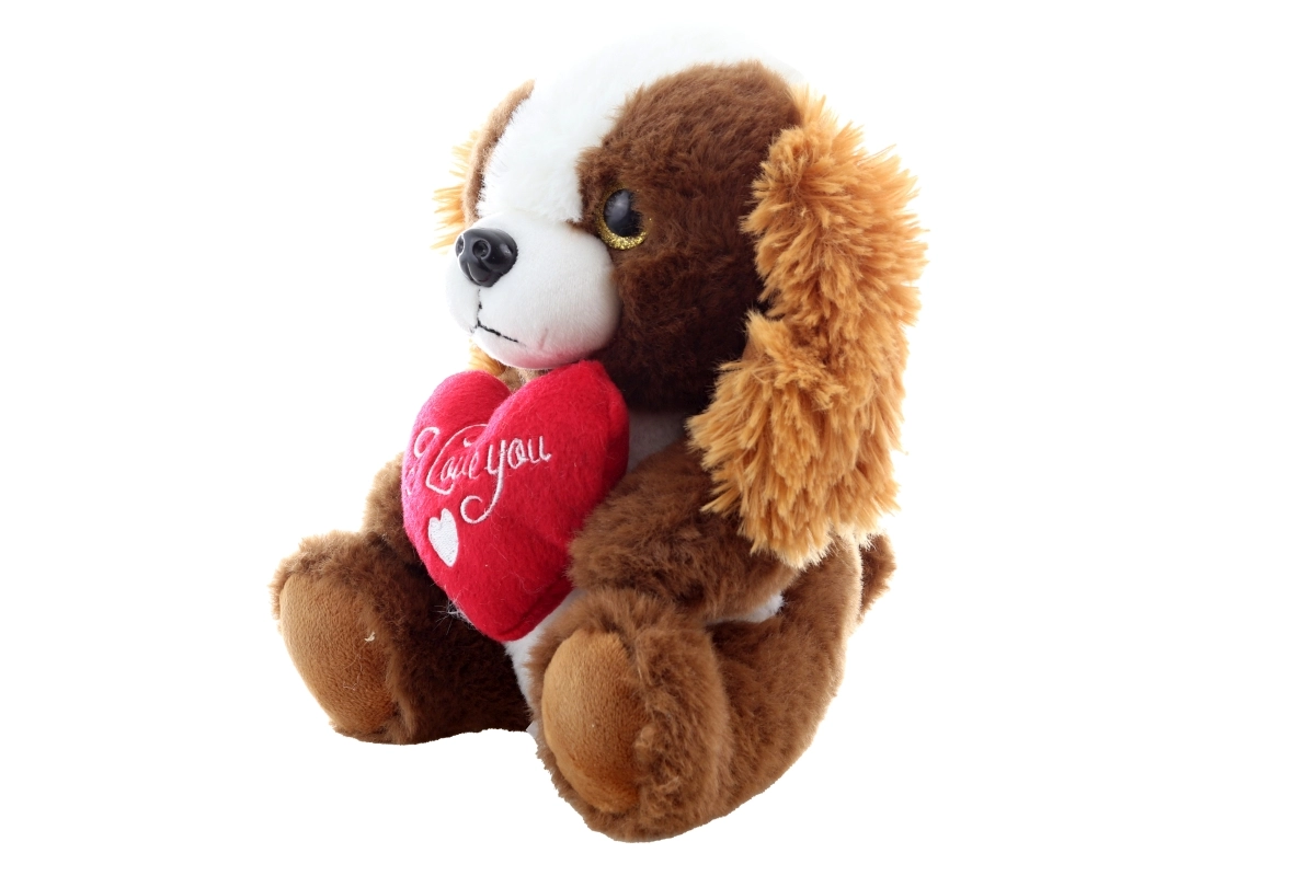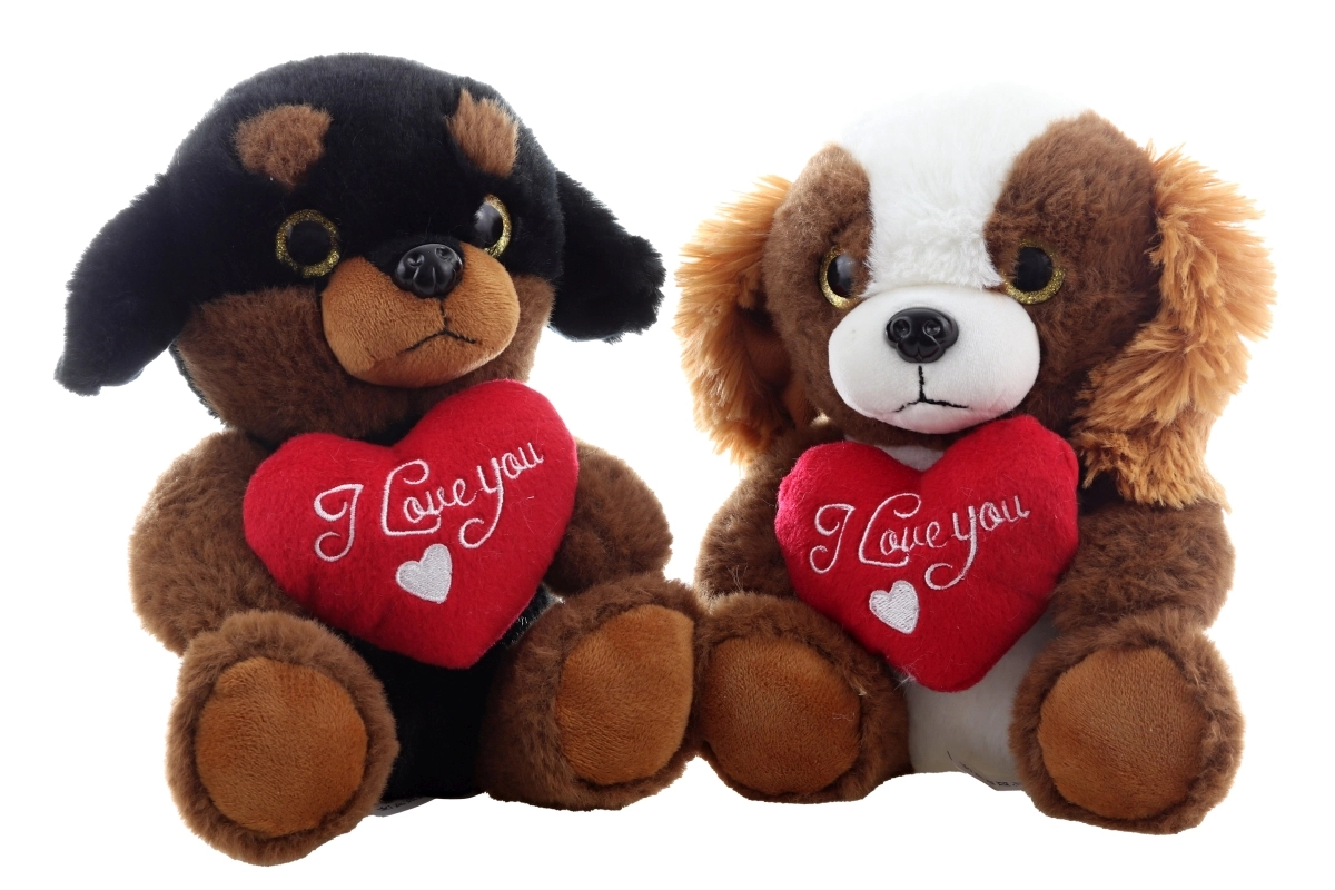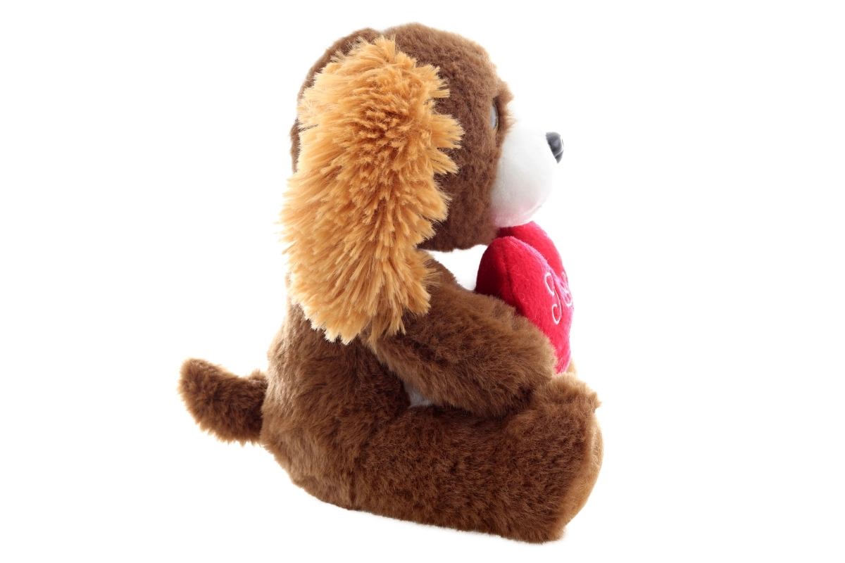 Hunden er cirka 21 cm høj, sidder pænt og holder et rødt hjerte med teksten ”I love you” i forpoterne. Fås i to farveudgaver (leveres efter lagerstatus). Velegnet fra nyfødt.