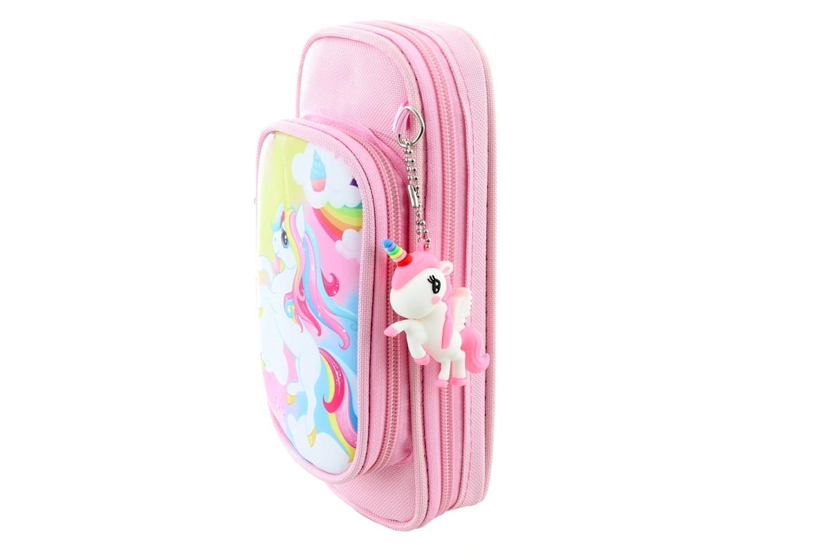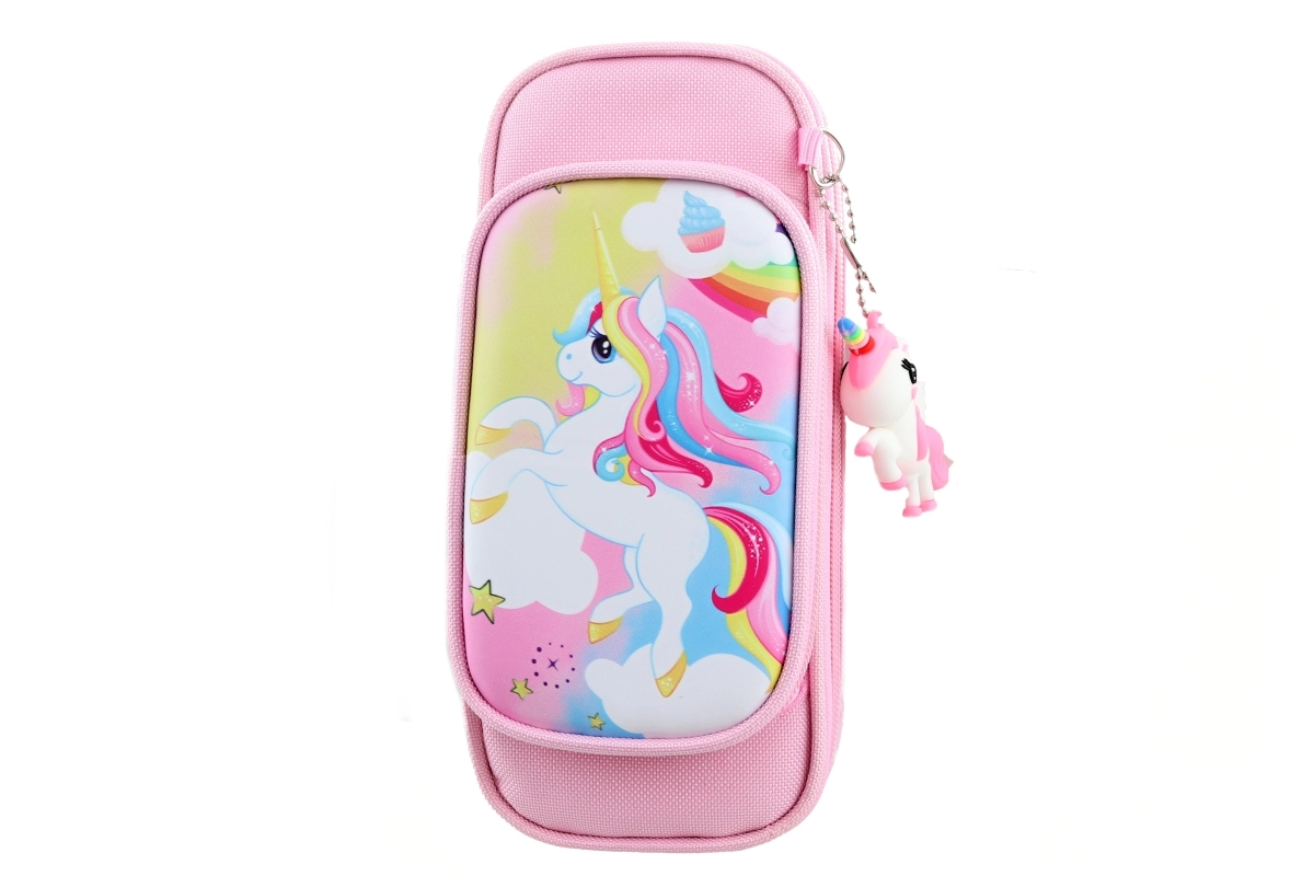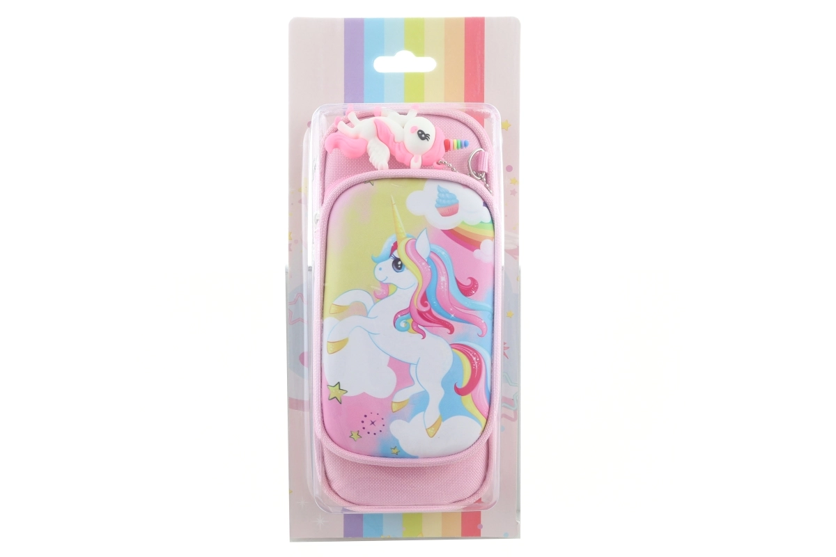 Pakken indeholder også et charmerende enhjørningevedhæng, der kan bruges som pynt på lynlåsen eller som nøglering. Penalhuset er lavet af blødt tekstil, ligger behageligt i hånden og er holdbart til daglig brug. Den kompakte størrelse gør det nemt at opbevare i rygsæk eller taske.