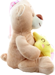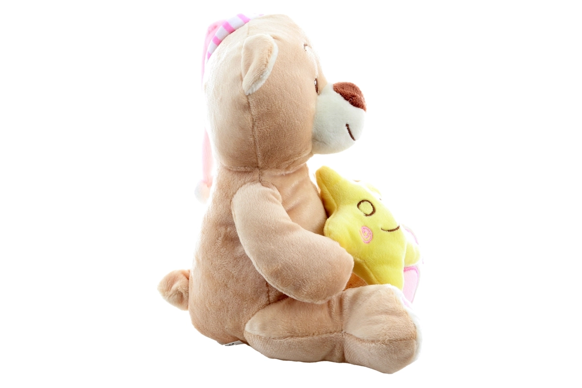 Sød plysset bamse med lyserød nathue og en smilende lille stjerne er den ideelle puttemakker til de allermindste. Den er ekstra blød, sikker fra 0+ og perfekt til hygge i seng eller barnevogn.