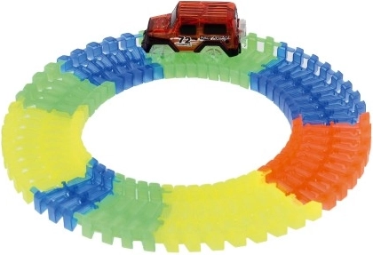 De neonfarvede banestykker lyser flot i mørke, og takket være den fleksible konstruktion kan du bøje dem frit og samle nye ruter. At ændre banen tager kun et øjeblik.