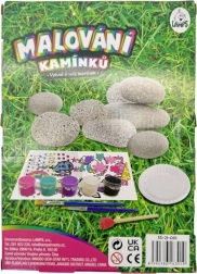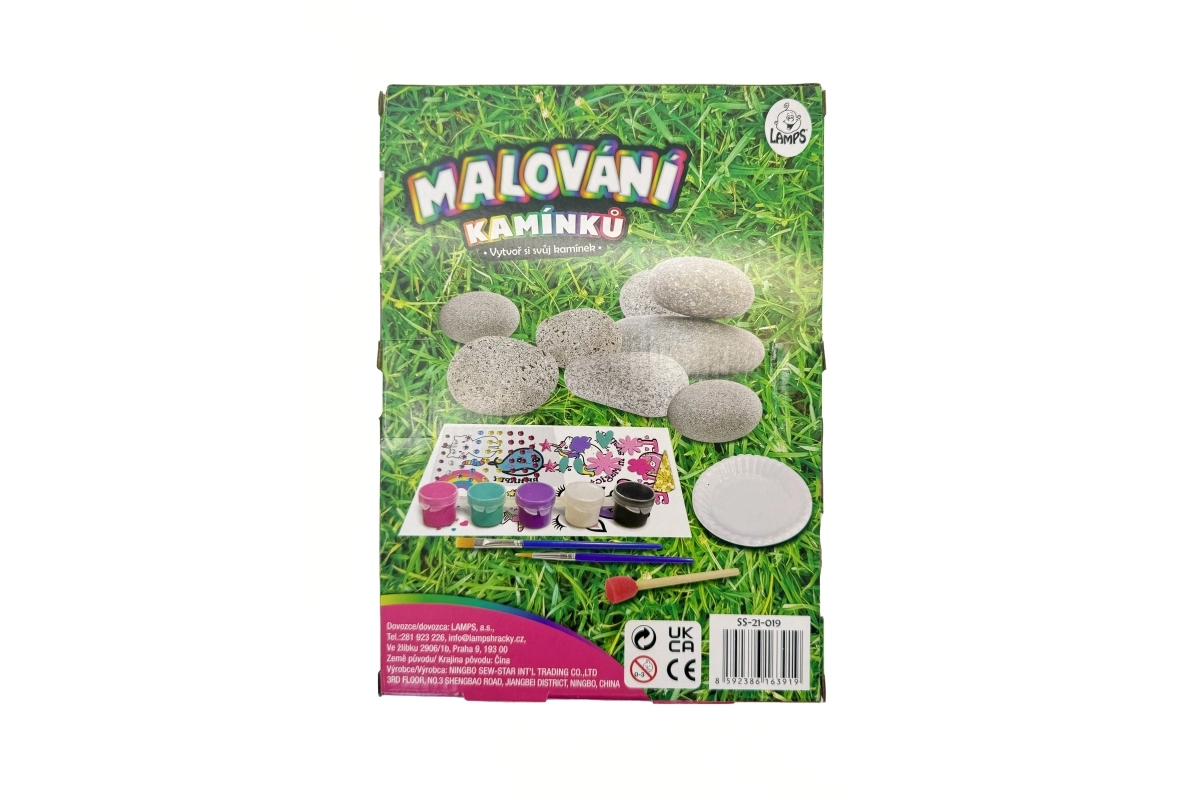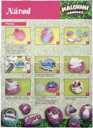 Sættet indeholder 8 sten, 5 farver, 2 pensler, 52 selvklæbende juveler og yderligere tilbehør. Takket være de let genlukkelige malebægre og skumsvampen bliver arbejdet renere og mere præcist. Pakkemål ca. 18 × 25 × 5 cm. Alder: 3+.