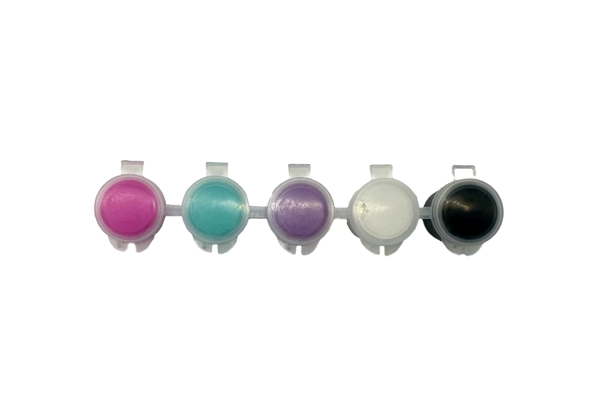 Sættet indeholder 5 pastelnuancer i sammenkoblede bægre med opklappelige låg. Farverne hældes ikke over og spildes mindre – ideelt til børns kreativitet.