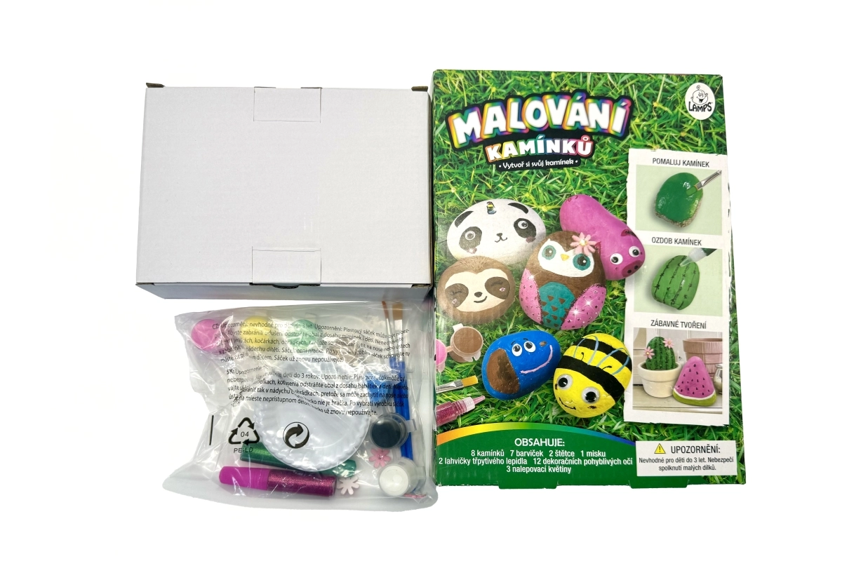 Sættet indeholder sten, farver, pensler, palet og pynt – børn kan gå i gang uden at skaffe ekstra materialer.