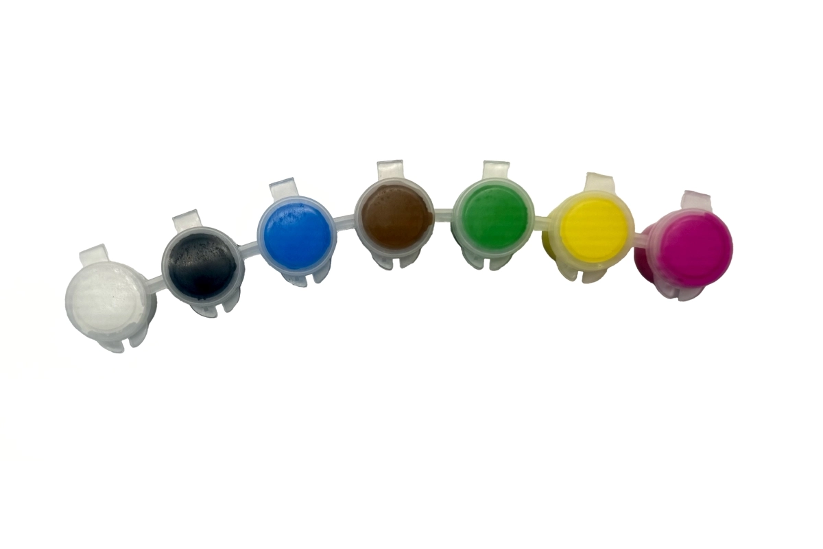 Praktisk sammenkoblede bægre med låg holder farverne friske og rene længere. Perfekt til gentagen kreativ leg uden rod.