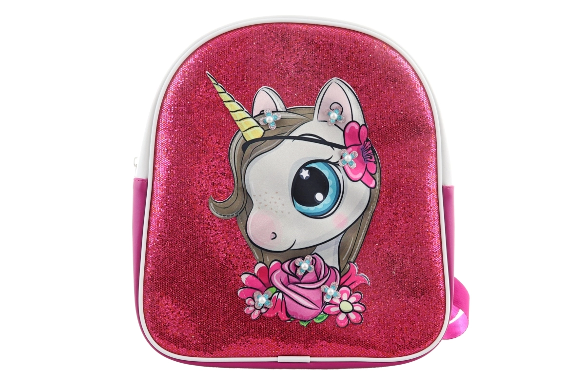 Den glitrende front med stofmotiv fanger øjet med det samme og giver rygsækken et magisk udtryk, som børn vil elske.