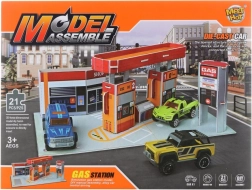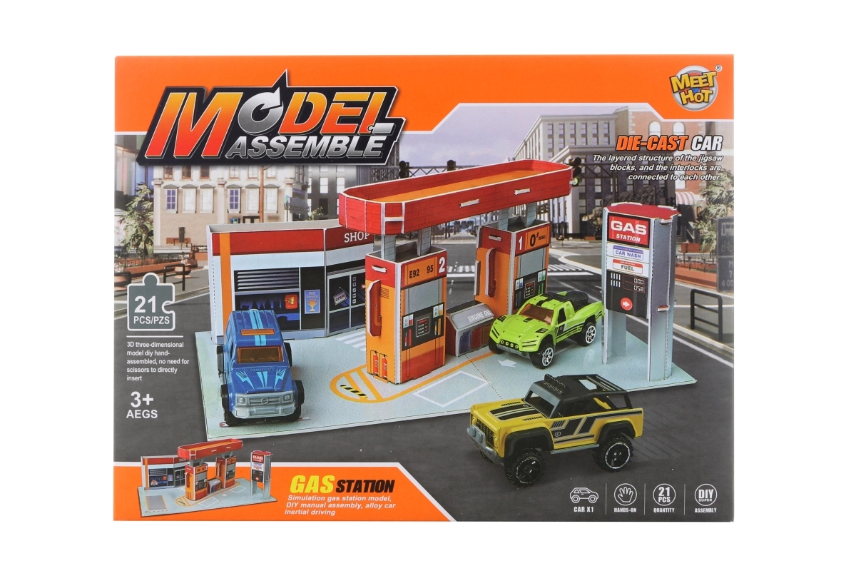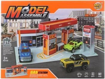 De enkelte dele af blød karton forbindes nemt og danner en stabil model af en benzinstation med praktiske mål til leg på bord eller gulv. Hele pakken er kompakt og egner sig også som en fantastisk gave til små bil- og byggefans.