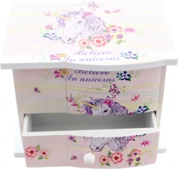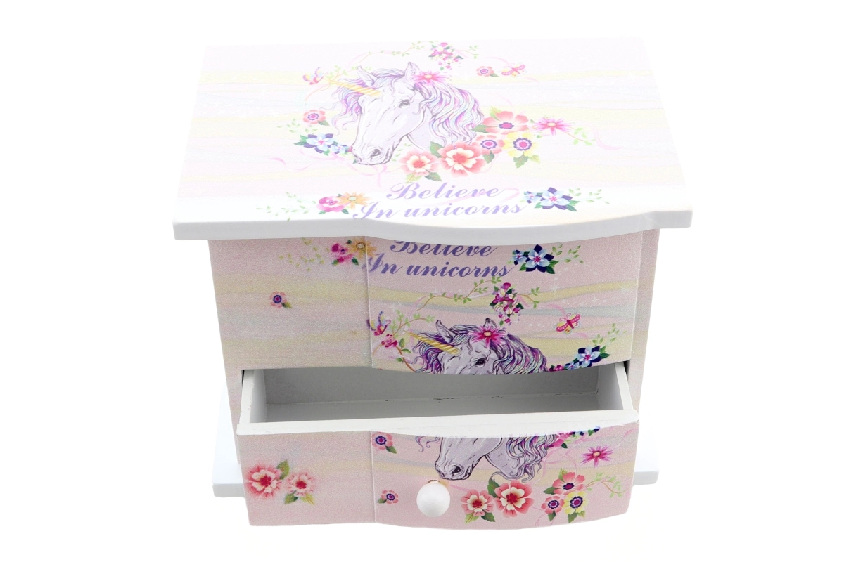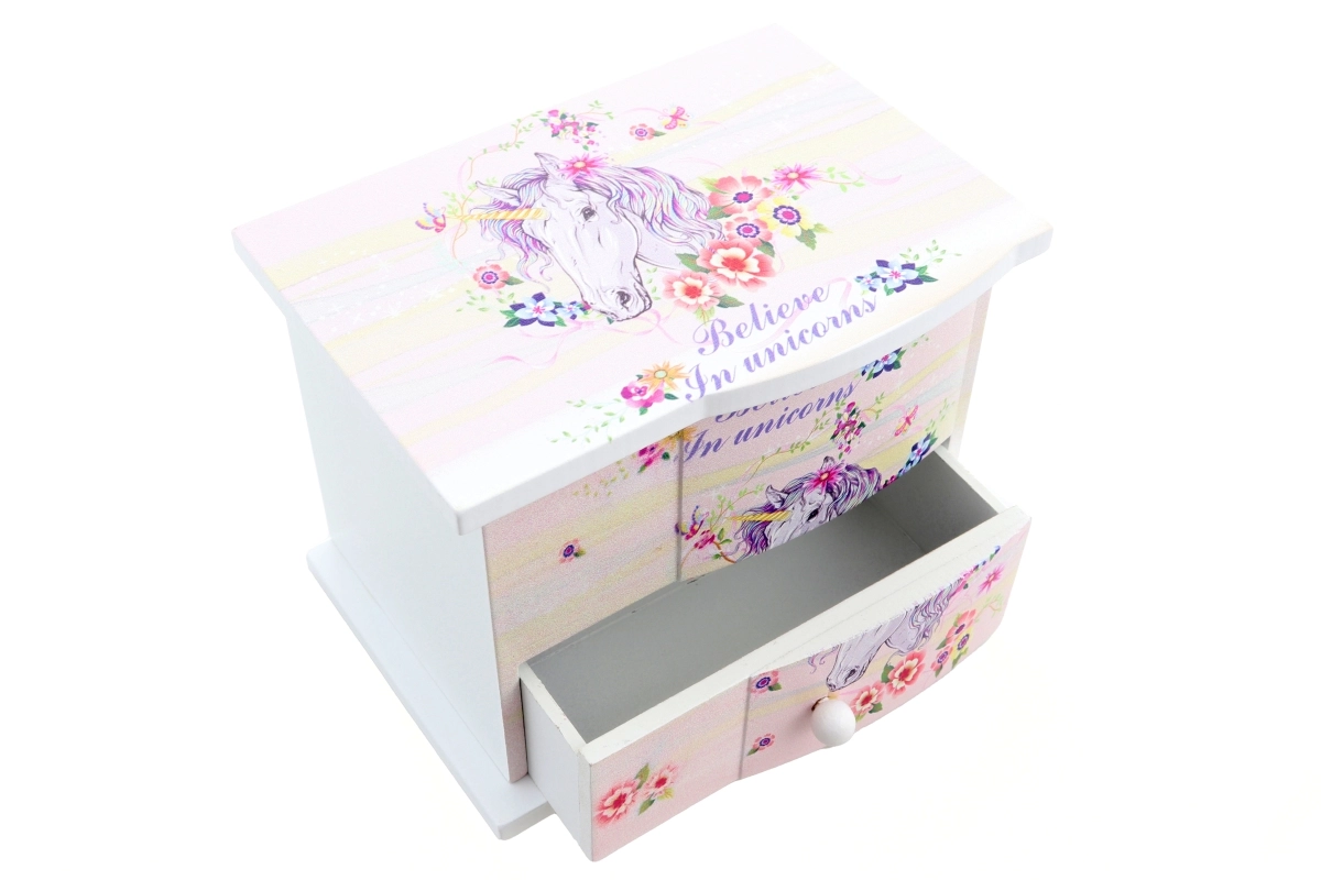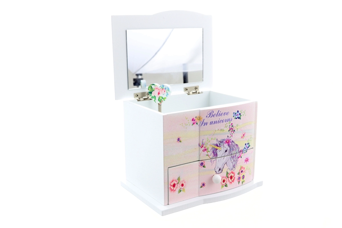 Dette charmerende træ-smykkeskrin med enhjørningemotiv beskytter fint barnets skatte – ringe, armbånd og hemmelige småting. Når låget åbnes, snurrer et hjerte og en blid melodi lyder, som fremkalder et smil hver gang. Øverst gemmer sig et praktisk spejl til hurtig afprøvning af smykker, og nederst finder du en skuffe til flere småting.