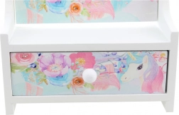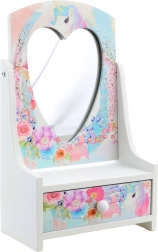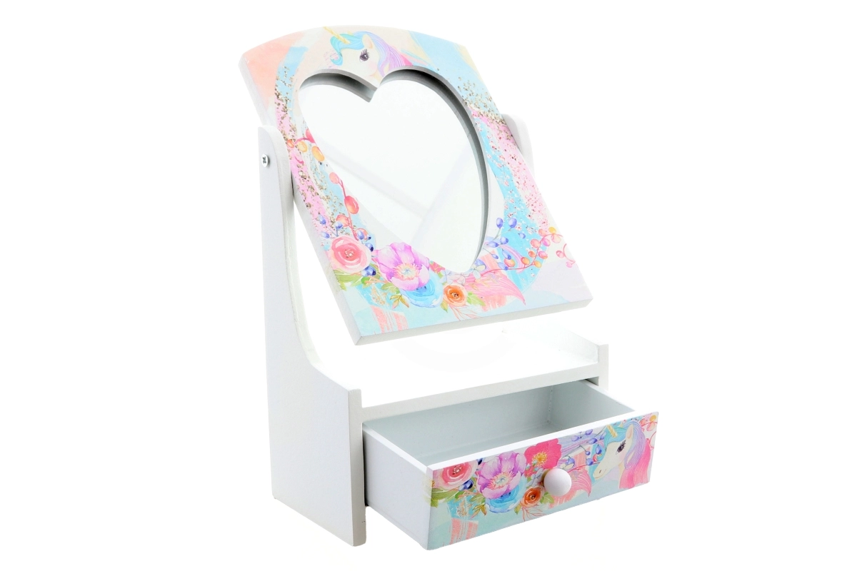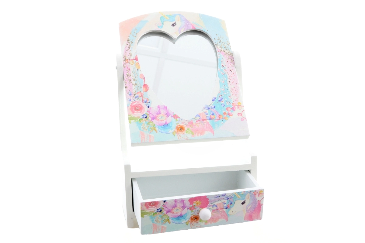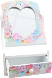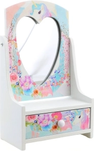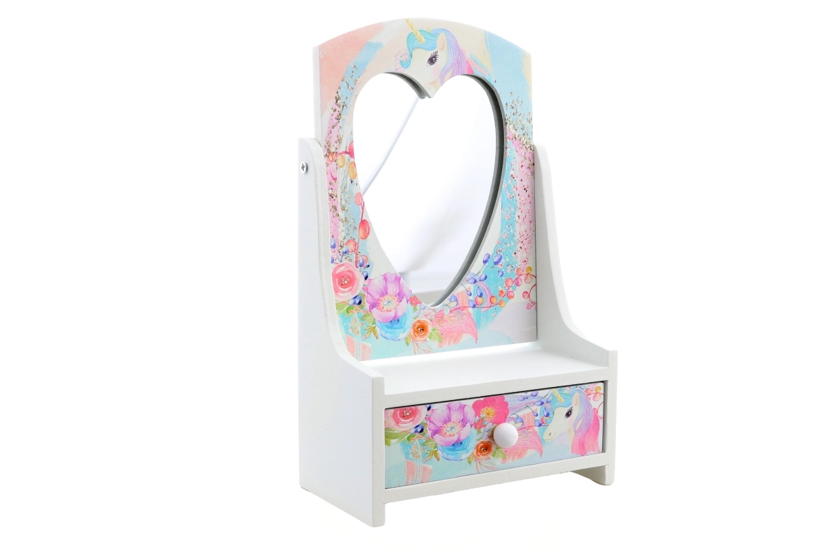 Det søde smykkeskrin i træ med et vipbart hjerteformet spejl hjælper børn med at holde deres skatte overskueligt samlet ét sted. De fine pastelfarvede blomster- og enhjørningemotiver gør det til både en smuk dekoration på børneværelset og en praktisk hjælper til daglig frisering og leg.