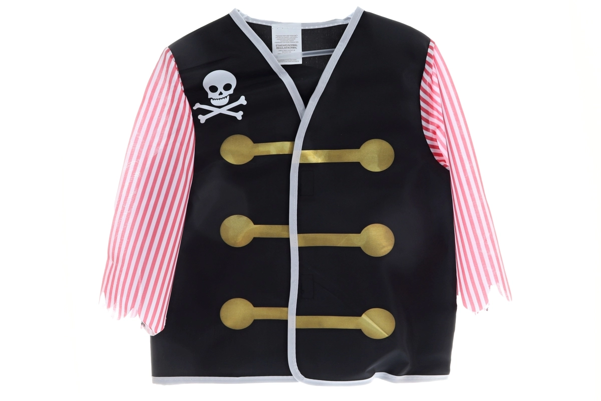 Dette børne-piratkostume forvandler små eventyrere til skibets kaptajn. Sættet indeholder alt, hvad der skal til til stilfuld udklædning og fantasifuld leg – ikonisk kappe med kraniemotiv, pirathat, øjenklap, sabel og kikkert (dekorativ, ikke-funktionel). Takket være de lette materialer er kostumet behageligt at have på og let at tage af og på.