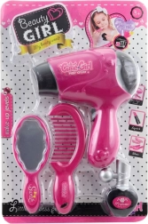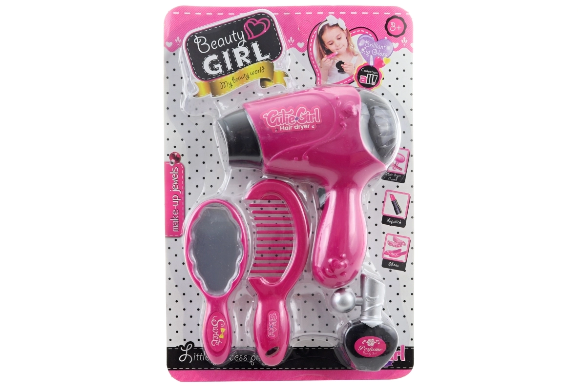 Dette frisørsæt til børn vil glæde alle små stylister. Den lette batteridrevne hårtørrer er sikker for børnehænder, og sammen med spejl, kam og en flaske til “parfume” skaber den det perfekte udstyr til at lege frisørsalon. Takket være de kompakte mål er sættet nemt at bære og opbevare.